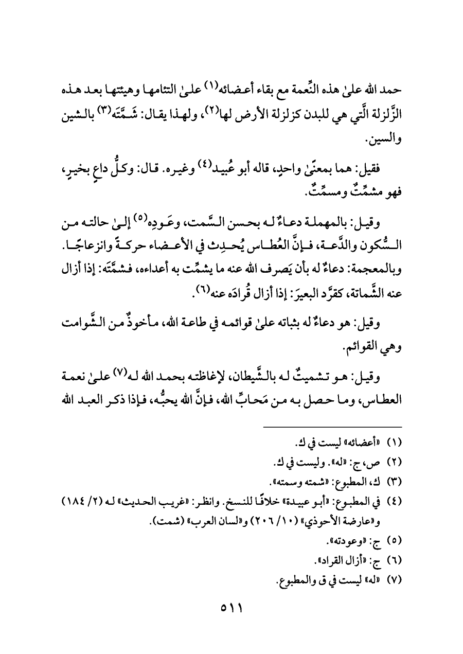 (¬٤) في المطبوع: «أبو عبيدة» خلافًا للنسخ. وانظر: «غريب الحديث» له (٢/ ١٨٤) و «عارضة الأحوذي» (١٠/ ٢٠٦) و «لسان العرب» (شمت).