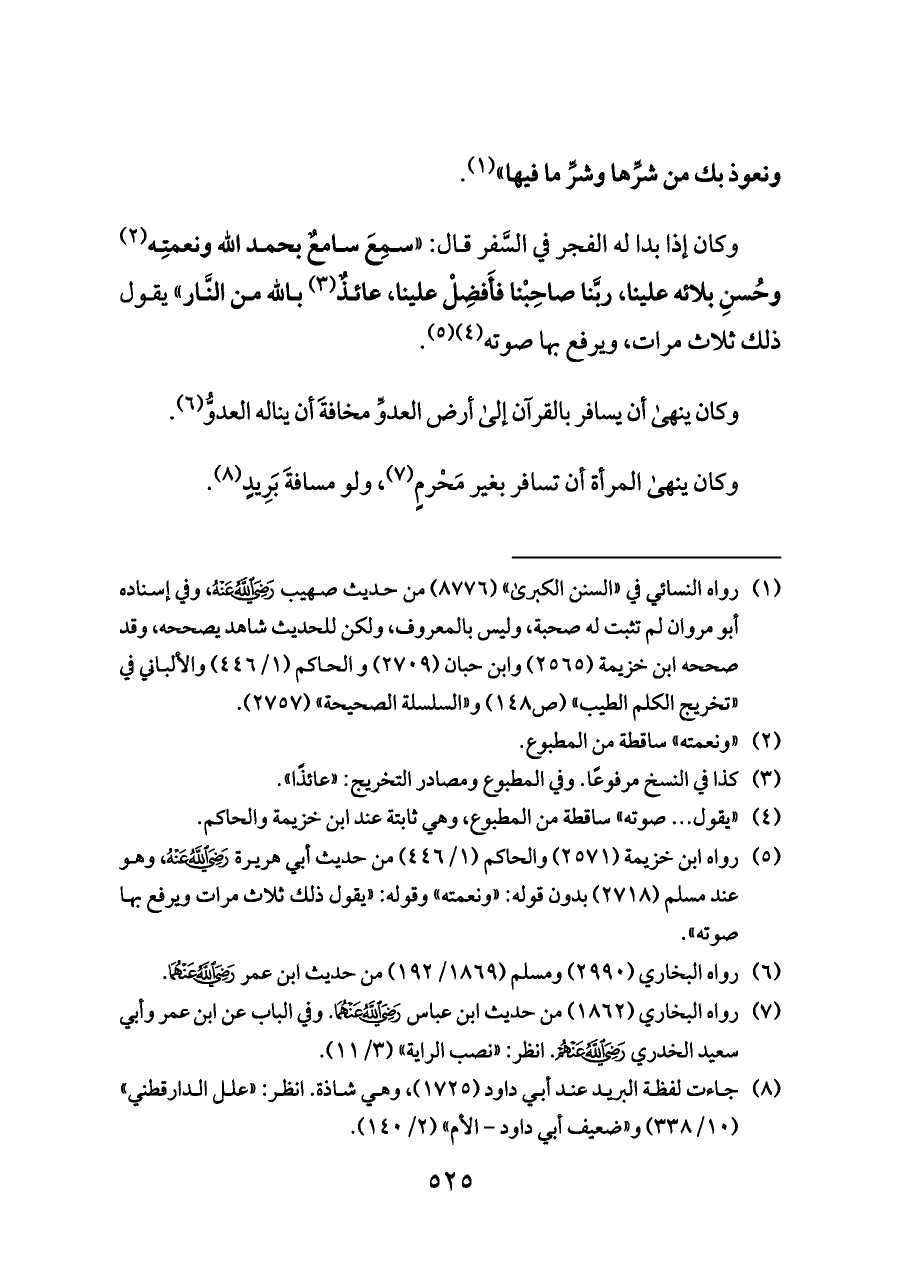 وكان إذا بدا له الفجر في السَّفر قال: «سمِعَ سامعٌ بحمد الله ونعمتِه (¬٢) وحُسنِ بلائه علينا، ربَّنا صاحِبْنا فأَفضِلْ علينا، عائذٌ (¬٣) بالله من النَّار» يقول ذلك ثلاث مرات، ويرفع بها صوته (¬٤) (¬٥).