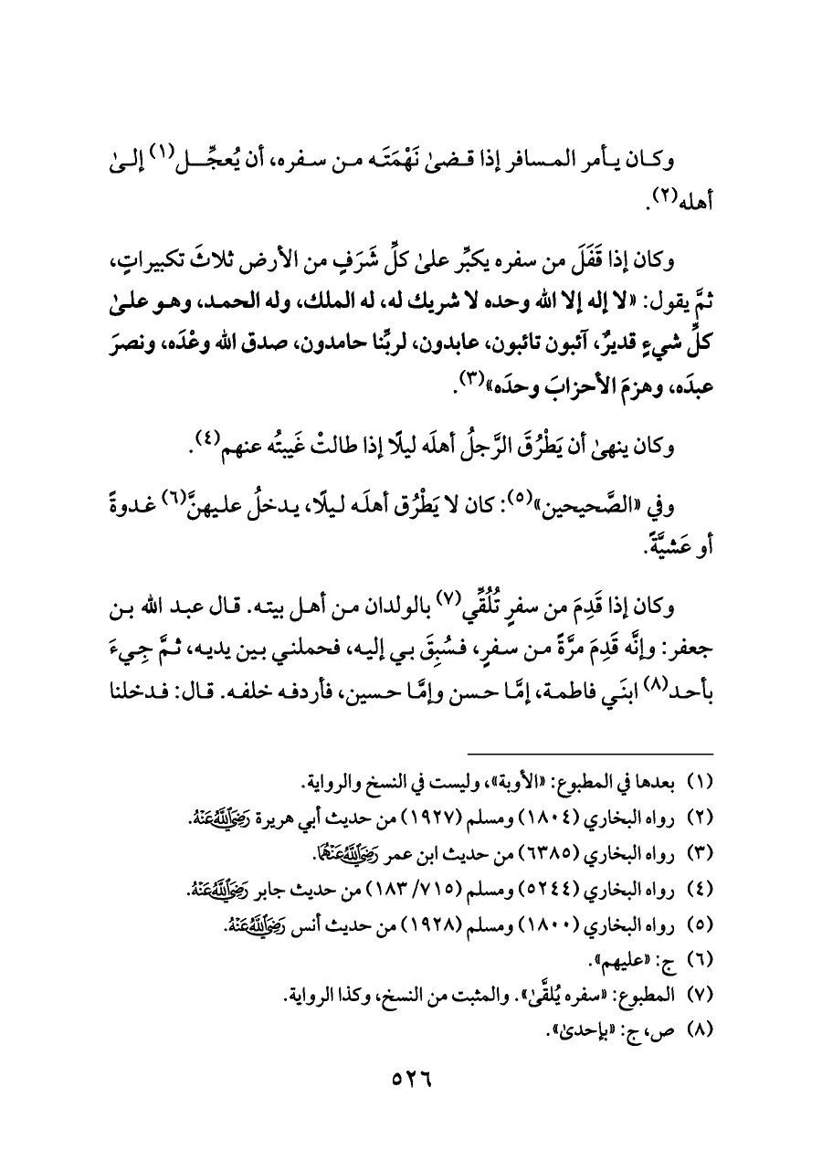 وكان إذا قَفَلَ من سفره يكبِّر على كلِّ شَرَفٍ من الأرض ثلاثَ تكبيراتٍ، ثمَّ يقول: «لا إله إلا الله وحده لا شريك له، له الملك، وله الحمد، وهو على كلِّ شيءٍ قديرٌ، آئبون تائبون، عابدون، لربِّنا حامدون، صدق الله وعْدَه، ونصرَ عبدَه، وهزمَ الأحزابَ وحدَه» (¬٣).