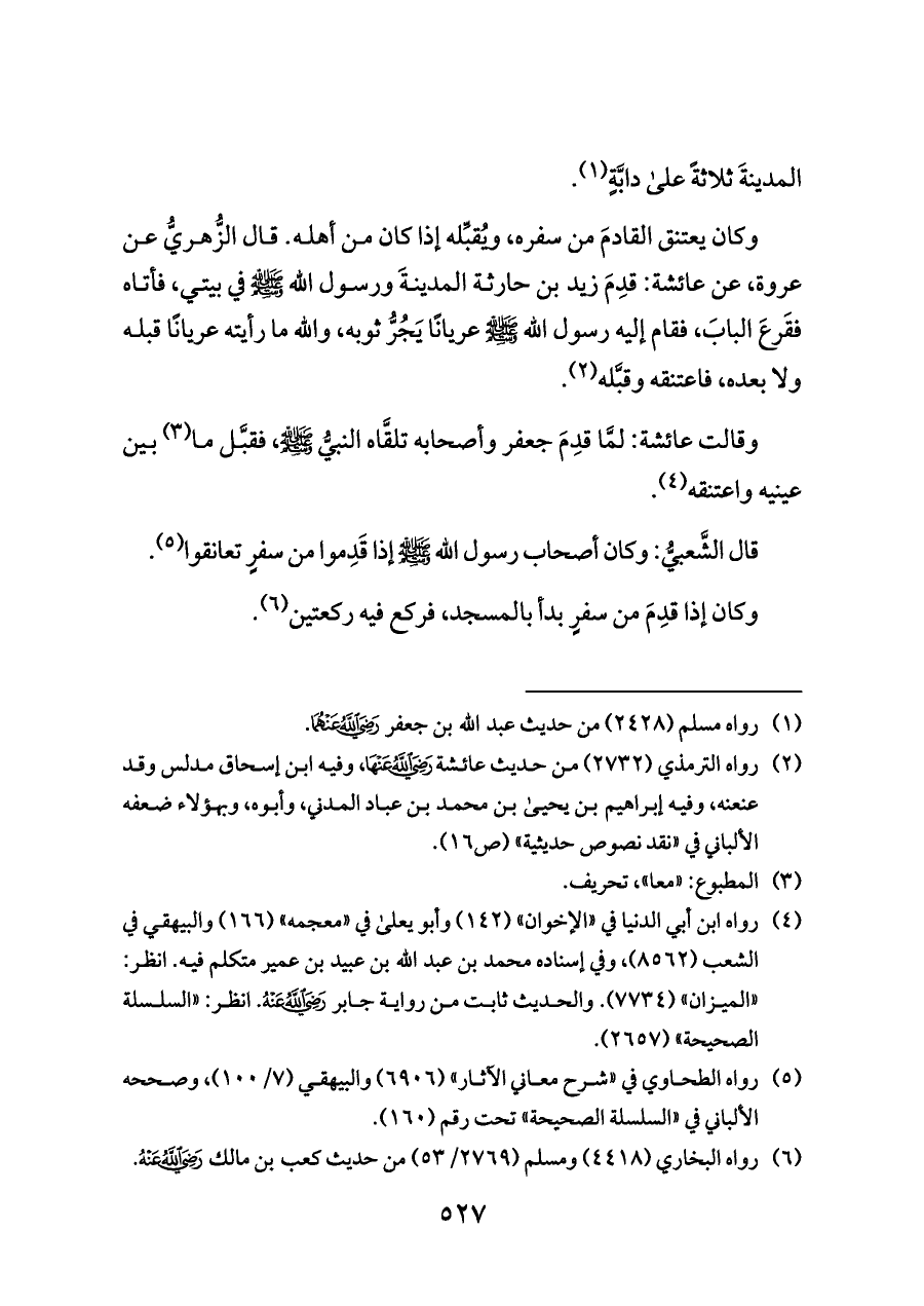 وكان يعتنق القادمَ من سفره، ويُقبِّله إذا كان من أهله. قال الزُّهريُّ عن عروة، عن عائشة: قدِمَ زيد بن حارثة المدينةَ ورسول الله - صلى الله عليه وسلم - في بيتي، فأتاه فقَرعَ البابَ، فقام إليه رسول الله - صلى الله عليه وسلم - عريانًا يَجُرُّ ثوبه، والله ما رأيته عريانًا قبله ولا بعده، فاعتنقه وقبَّله (¬٢).