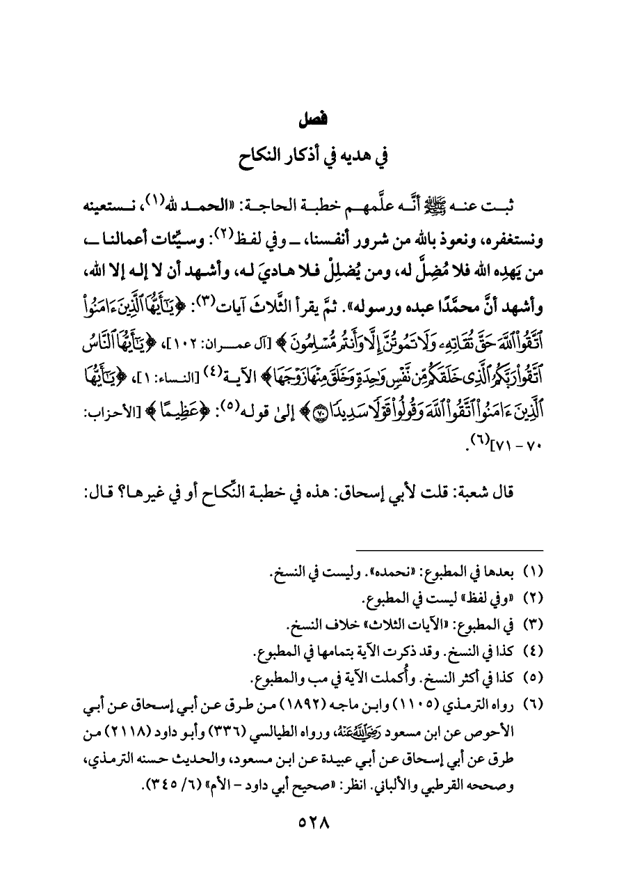 قال شعبة: قلت لأبي إسحاق: هذه في خطبة النِّكاح أو في غيرها؟ قال: