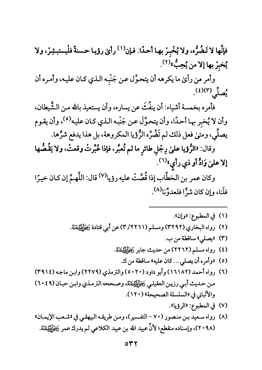 فإنَّها لا تَضُرُّه، ولا يُخْبِرْ بها أحدًا. فإن (¬١) رأى رؤيا حسنةً فلْيستبشِرْ، ولا يُخبِرْ بها إلا من يُحِبُّ» (¬٢).