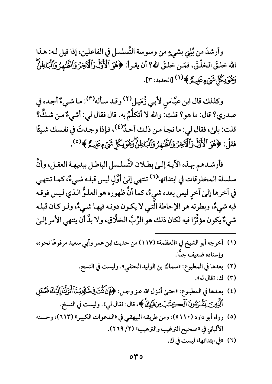 وأرشدَ من بُلِيَ بشيءٍ من وسوسة التَّسلسل في الفاعلين، إذا قيل له: هذا الله خلقَ الخلْقَ، فمَن خلقَ اللَّه؟ أن يقرأ: {هُوَ الْأَوَّلُ وَالْآخِرُ وَالظَّاهِرُ وَالْبَاطِنُ وَهُوَ بِكُلِّ شَيْءٍ عَلِيمٌ} (¬١) [الحديد: ٣].