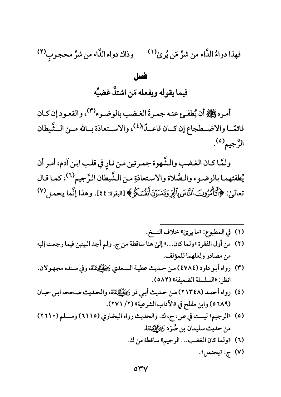 ولمَّا كان الغضب والشَّهوة جمرتين من نارٍ في قلب ابن آدم، أمر أن يُطفئهما بالوضوء والصَّلاة والاستعاذةِ من الشَّيطان الرَّجيم (¬٦)، كما قال تعالى: {أَتَأْمُرُونَ النَّاسَ بِالْبِرِّ وَتَنْسَوْنَ أَنْفُسَكُمْ} [البقرة: ٤٤]. وهذا إنَّما يحمل (¬٧)