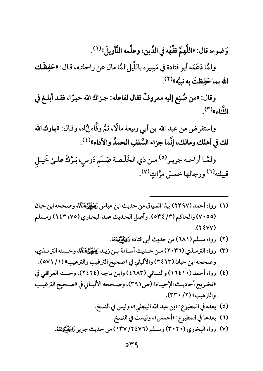 ولمَّا أراحه جرير (¬٥) من ذي الخَلَصة صَنَمِ دَوسٍ، بَرَّكَ على خَيلِ قبيلته (¬٦) ورجالها خمسَ مرَّاتٍ (¬٧).