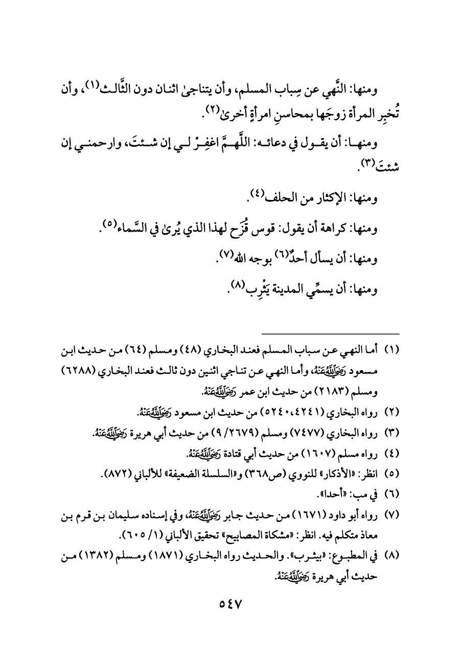 (¬١) أما النهي عن سباب المسلم فعند البخاري (٤٨) ومسلم (٦٤) من حديث ابن مسعود- رضي الله عنه -، وأما النهي عن تناجي اثنين دون ثالث فعند البخاري (٦٢٨٨) ومسلم (٢١٨٣) من حديث ابن عمر - رضي الله عنه -.