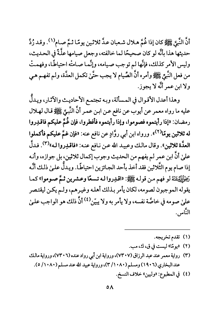 وهذا أعدل الأقوال في المسألة، وبه تجتمع الأحاديث والآثار، ويدلُّ عليه ما رواه معمر عن أيوب عن نافع عن ابن عمر أنَّ النَّبيَّ - صلى الله عليه وسلم - قال لهلال رمضان: «إذا رأيتموه فصوموا، وإذا رأيتموه فأفطروا، فإن غُمَّ عليكم فاقدِروا له ثلاثين يومًا (¬٢)». ورواه ابن أبي روَّادٍ عن نافع عنه: «فإن غمَّ عليكم فأكملوا العدَّة ثلاثين». وقال مالك وعبيد الله عن نافع عنه: «فاقدِروا له» (¬٣). فدلَّ على أنَّ ابن عمر لم يفهم من الحديث وجوب إكمال ثلاثين، بل جوازه، وأنه إذا صام يوم الثَّلاثين فقد أخذ بأحد الجائزين احتياطًا. ويدلُّ على ذلك أنَّه - رضي الله عنه - لو فهم من قوله - صلى الله عليه وسلم -: «اقدِروا له تسعًا وعشرين ثمَّ صوموا» كما يقوله الموجبون لصومه، لكان يأمر بذلك أهله وغيرهم، ولم يكن ليقتصر على صومه في خاصَّة نفسه، ولا يأمر به ولا يبيّن (¬٤) أنَّ ذلك هو الواجب على النَّاس.