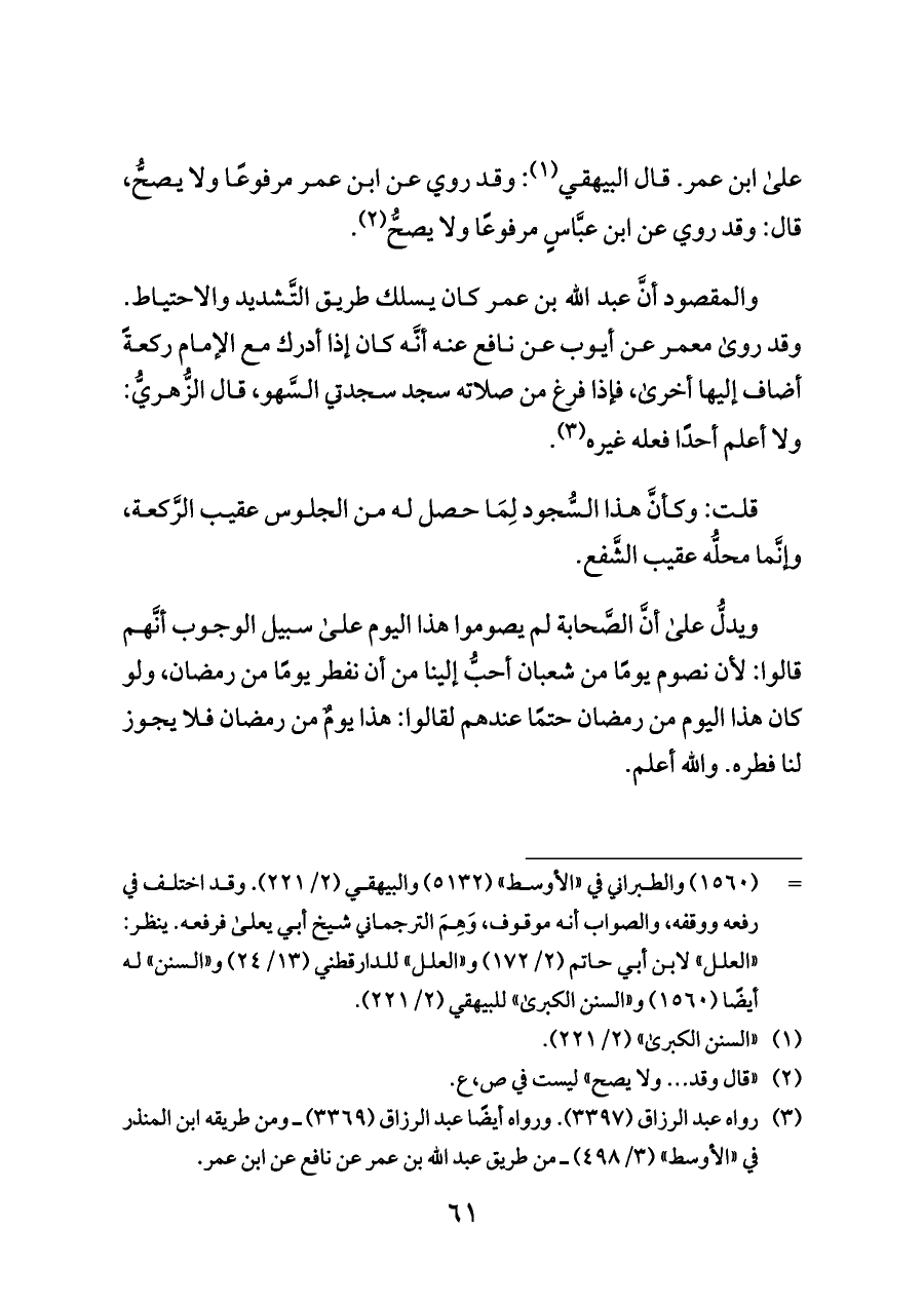 والمقصود أنَّ عبد الله بن عمر كان يسلك طريق التَّشديد والاحتياط. وقد روى معمر عن أيوب عن نافع عنه أنَّه كان إذا أدرك مع الإمام ركعةً أضاف إليها أخرى، فإذا فرغ من صلاته سجد سجدتي السَّهو، قال الزُّهريُّ: ولا أعلم أحدًا فعله غيره (¬٣).