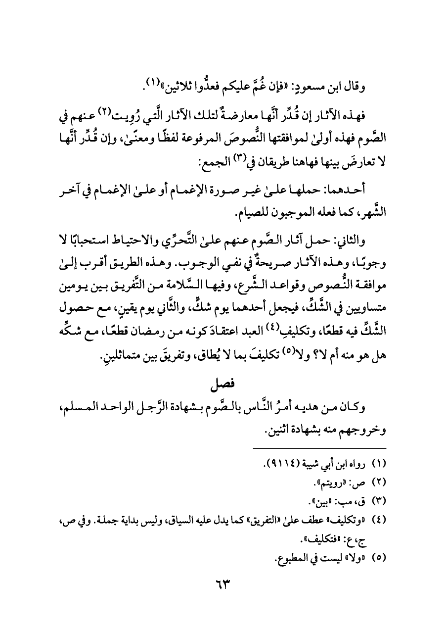 والثاني: حمل آثار الصَّوم عنهم على التَّحرِّي والاحتياط استحبابًا لا وجوبًا، وهذه الآثار صريحةٌ في نفي الوجوب. وهذه الطريق أقرب إلى موافقة النُّصوص وقواعد الشَّرع، وفيها السَّلامة من التَّفريق بين يومين متساويين في الشَّكِّ، فيجعل أحدهما يوم شكٍّ، والثَّاني يوم يقينٍ، مع حصول الشَّكِّ فيه قطعًا، وتكليفِ (¬٤) العبد اعتقادَ كونه من رمضان قطعًا، مع شكِّه هل هو منه أم لا؟ ولا (¬٥) تكليفَ بما لا يُطاق، وتفريقَ بين متماثلينِ.