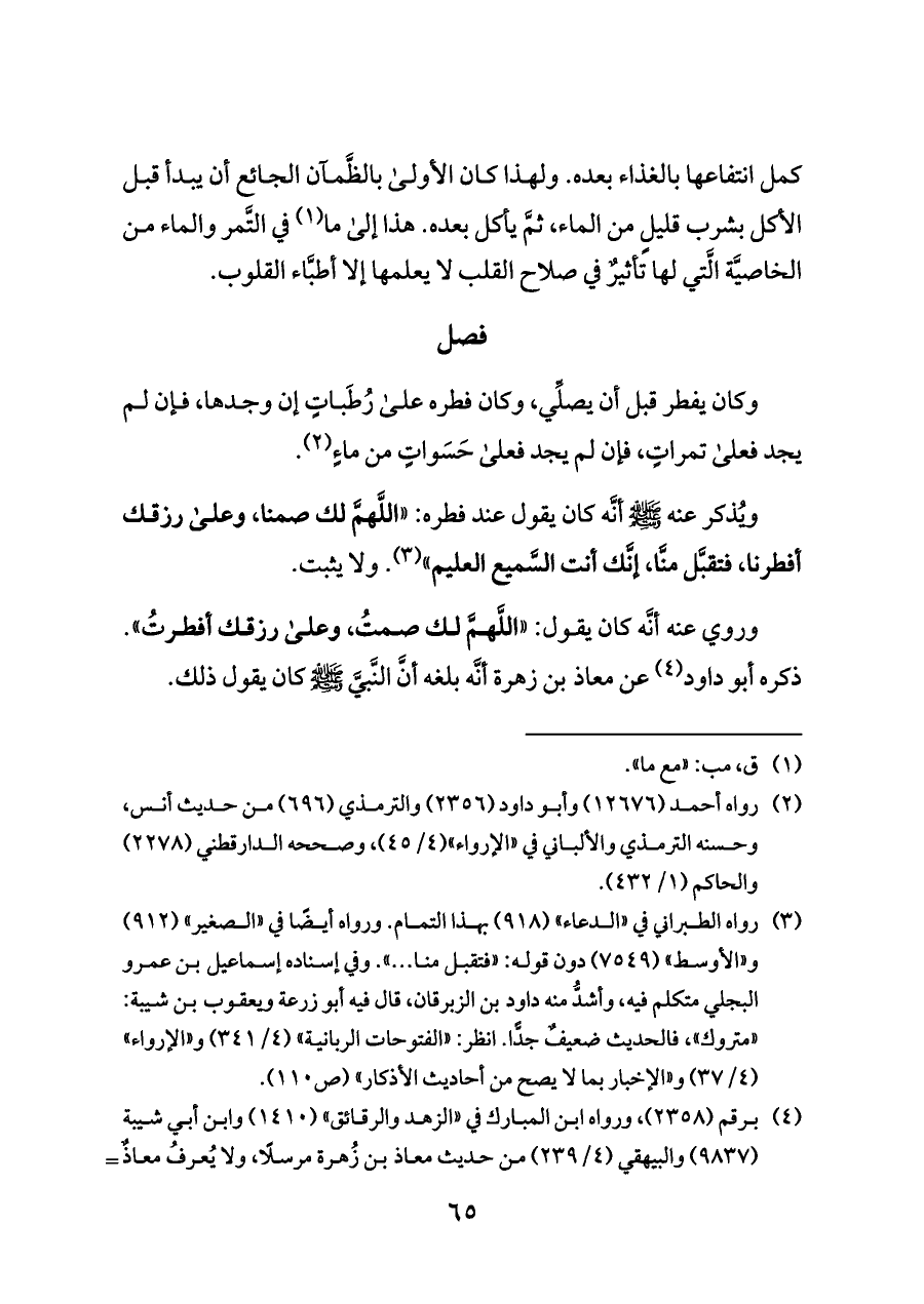 ويُذكر عنه - صلى الله عليه وسلم - أنَّه كان يقول عند فطره: «اللَّهمَّ لك صمنا، وعلى رزقك أفطرنا، فتقبَّل منَّا، إنَّك أنت السَّميع العليم» (¬٣). ولا يثبت.
