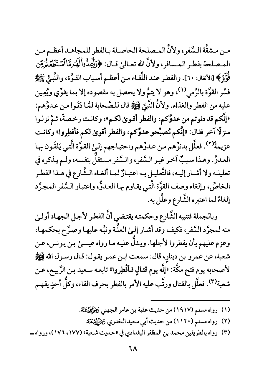 من مشقَّة السَّفر، ولأنَّ المصلحة الحاصلة بالفطر للمجاهد أعظم من المصلحة بفطر المسافر، ولأنَّ الله تعالى قال: {يُعْجِزُونَ (٥٩) وَأَعِدُّوا لَهُمْ مَا اسْتَطَعْتُمْ} [الأنفال: ٦٠]. والفطر عند اللِّقاء من أعظم أسباب القوَّة، والنَّبيُّ - صلى الله عليه وسلم - فسَّر القوَّة بالرَّمي (¬١)، وهو لا يتمُّ ولا يحصل به مقصوده إلا بما يقوِّي ويُعِين عليه من الفطر والغذاء. ولأنَّ النَّبيَّ - صلى الله عليه وسلم - قال للصَّحابة لمَّا دَنَوا من عدوِّهم: «إنَّكم قد دنوتم من عدوِّكم، والفطر أقوى لكم»، وكانت رخصةً، ثمَّ نزلوا منزلًا آخر فقال: «إنَّكم مُصبِّحو عدوِّكم، والفطر أقوى لكم فأفطِروا» وكانت عزيمةً (¬٢). فعلَّل بدنوِّهم من عدوِّهم واحتياجهم إلى القوَّة الَّتي يَلقَون بها العدوَّ.