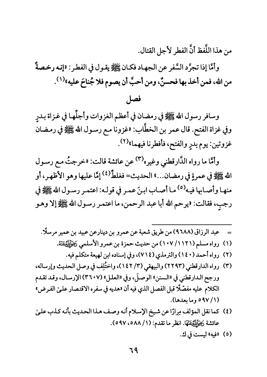 وسافر رسول الله - صلى الله عليه وسلم - في رمضان في أعظم الغزوات وأجلِّها في غزاة بدرٍ وفي غزاة الفتح. قال عمر بن الخطَّاب: «غزونا مع رسول الله - صلى الله عليه وسلم - في رمضان غزوتين: يوم بدرٍ والفتح، فأفطرنا فيهما» (¬٢).