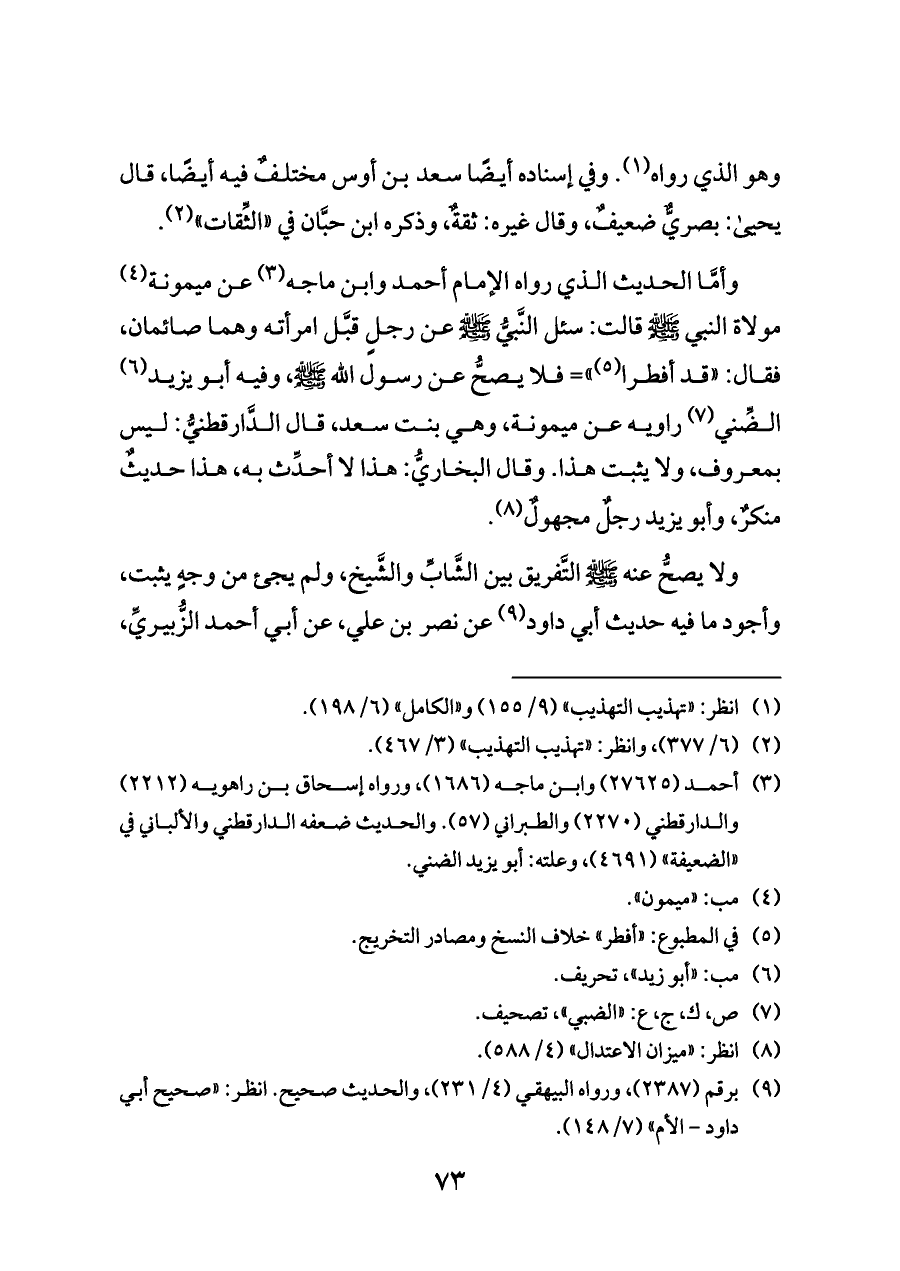 وأمَّا الحديث الذي رواه الإمام أحمد وابن ماجه (¬٣) عن ميمونة (¬٤) مولاة النبي - صلى الله عليه وسلم - قالت: سئل النَّبيُّ - صلى الله عليه وسلم - عن رجلٍ قبَّل امرأته وهما صائمان، فقال: «قد أفطرا (¬٥)» = فلا يصحُّ عن رسول الله - صلى الله عليه وسلم -، وفيه أبو يزيد (¬٦) الضِّني (¬٧) راويه عن ميمونة، وهي بنت سعد، قال الدَّارقطنيُّ: ليس بمعروف، ولا يثبت هذا. وقال البخاريُّ: هذا لا أحدِّث به، هذا حديثٌ منكرٌ، وأبو يزيد رجلٌ مجهولٌ (¬٨).