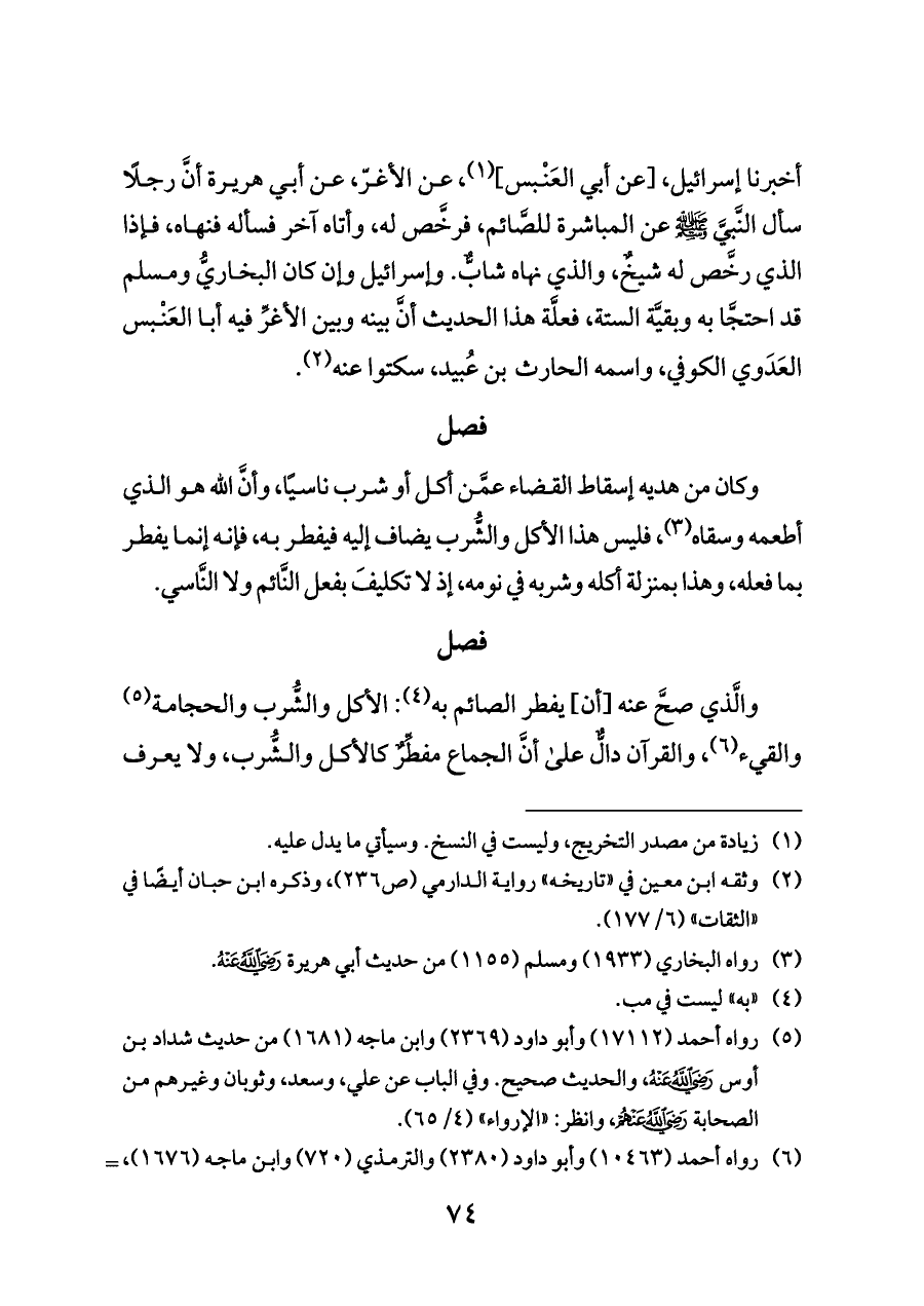 (¬٦) رواه أحمد (١٠٤٦٣) وأبو داود (٢٣٨٠) والترمذي (٧٢٠) وابن ماجه (١٦٧٦)، والحديث حسنه الترمذي، وصححه ابن حبان (٣٥١٨) والحاكم (١/ ٤٢٦)، وقال الدارقطني (٢٢٧٣): رواته كلهم ثقات، واحتجَّ به ابن تيمية ولم يعله. انظر: «مجموع الفتاوى» (٢٥/ ٢٢١ - ٢٢٢) و «الإرواء» (٤/ ٥١).
