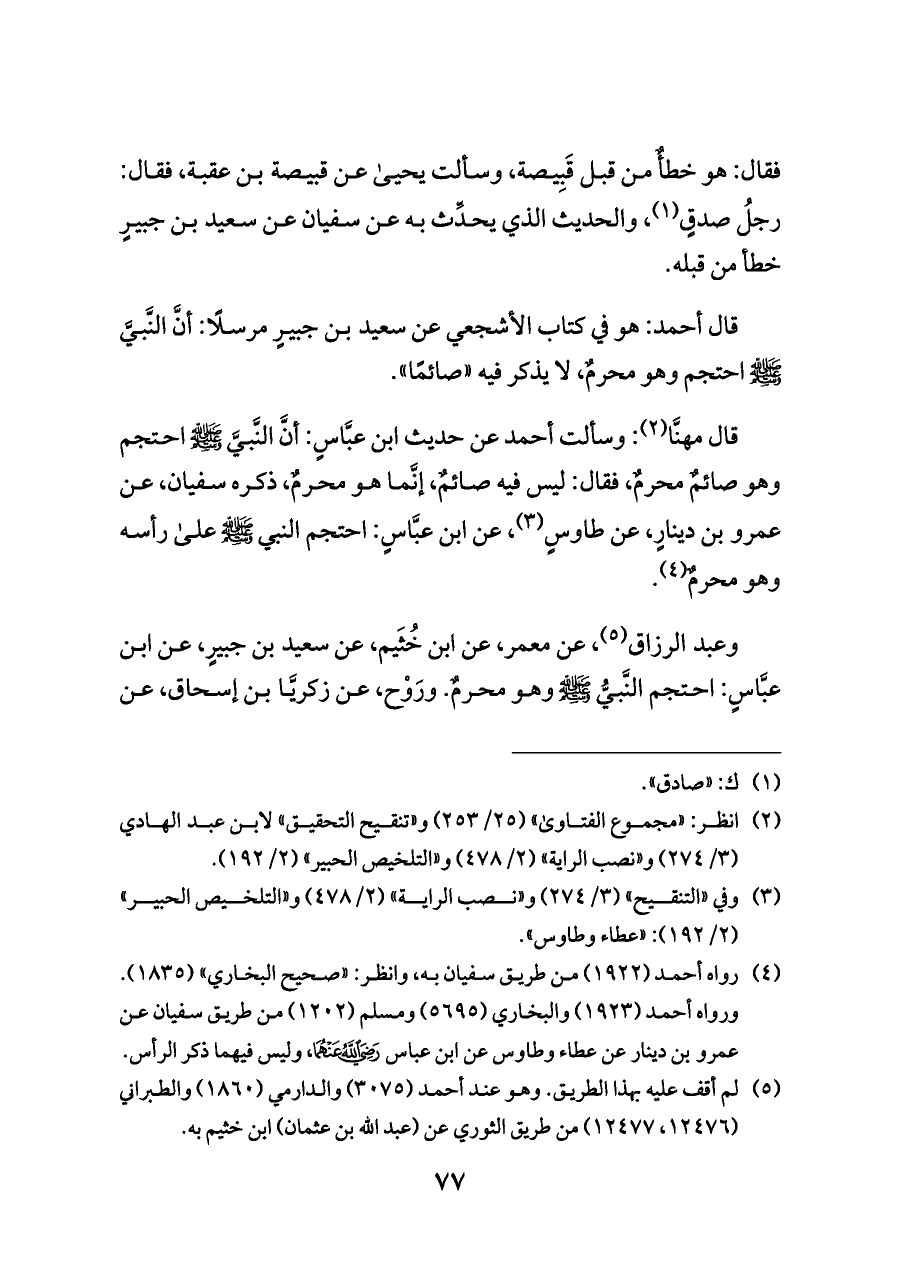 قال مهنَّا (¬٢): وسألت أحمد عن حديث ابن عبَّاسٍ: أنَّ النَّبيَّ - صلى الله عليه وسلم - احتجم وهو صائمٌ محرمٌ، فقال: ليس فيه صائمٌ، إنَّما هو محرمٌ، ذكره سفيان، عن عمرو بن دينارٍ، عن طاوسٍ (¬٣)، عن ابن عبَّاسٍ: احتجم النبي - صلى الله عليه وسلم - على رأسه وهو محرمٌ (¬٤).