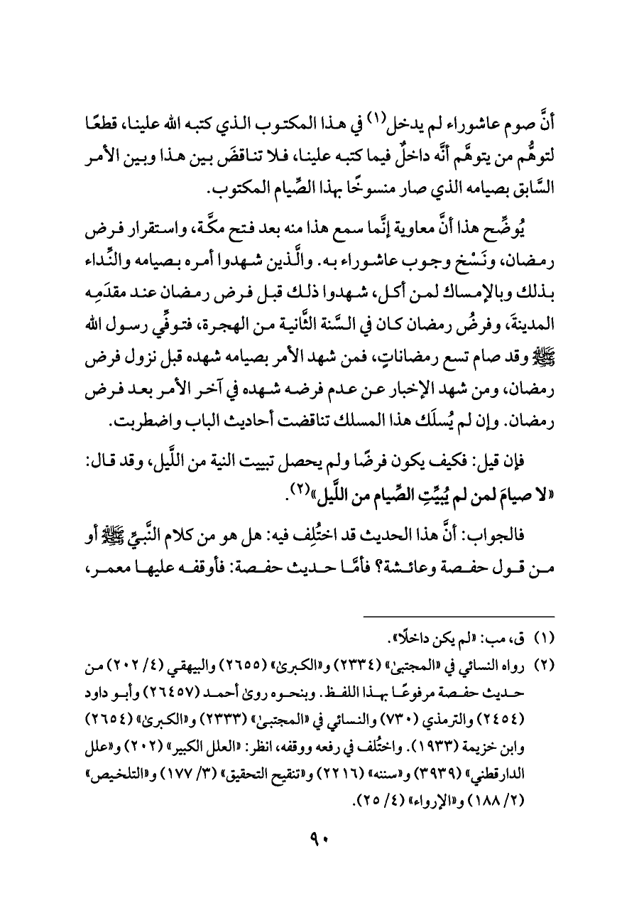 (¬٢) رواه النسائي في «المجتبى» (٢٣٣٤) و «الكبرى» (٢٦٥٥) والبيهقي (٤/ ٢٠٢) من حديث حفصة مرفوعًا بهذا اللفظ. وبنحوه روى أحمد (٢٦٤٥٧) وأبو داود (٢٤٥٤) والترمذي (٧٣٠) والنسائي في «المجتبى» (٢٣٣٣) و «الكبرى» (٢٦٥٤) وابن خزيمة (١٩٣٣). واختُلف في رفعه ووقفه، انظر: «العلل الكبير» (٢٠٢) و «علل الدارقطني» (٣٩٣٩) و «سننه» (٢٢١٦) و «تنقيح التحقيق» (٣/ ١٧٧) و «التلخيص» (٢/ ١٨٨) و «الإرواء» (٤/ ٢٥).