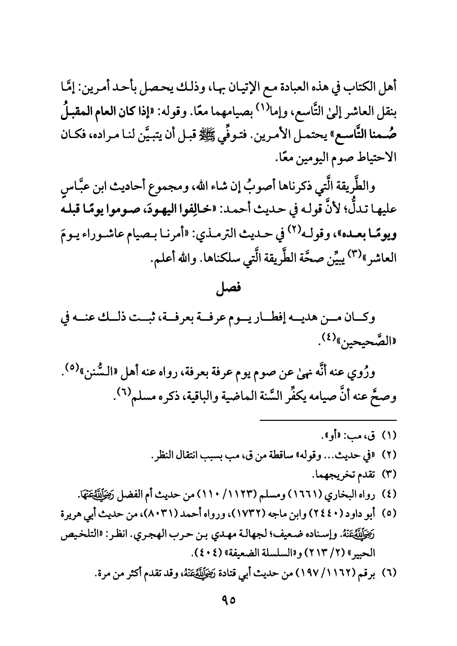 ورُوي عنه أنَّه نهى عن صوم يوم عرفة بعرفة، رواه عنه أهل «السُّنن» (¬٥). وصحَّ عنه أنَّ صيامه يكفِّر السَّنة الماضية والباقية، ذكره مسلم (¬٦).