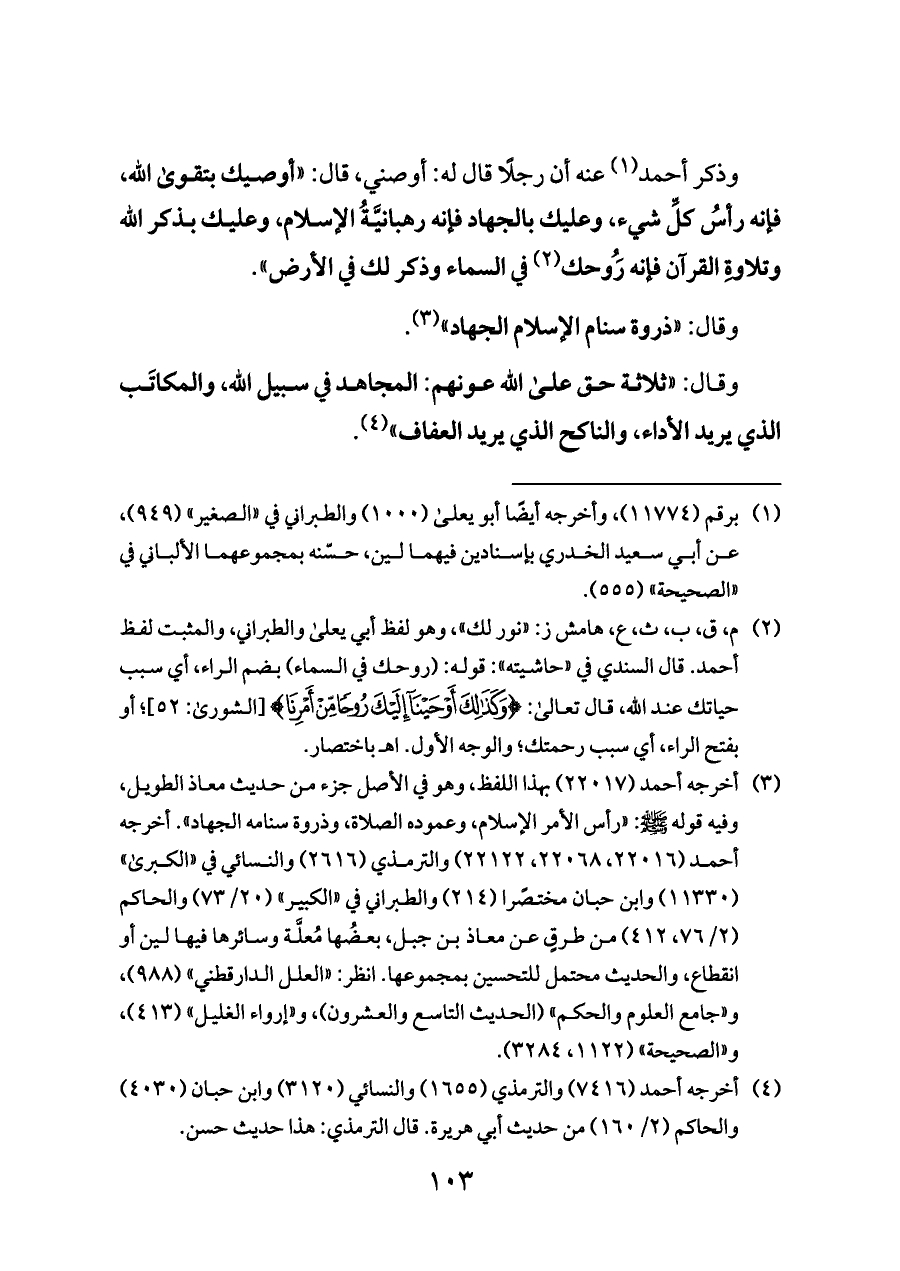 (¬٣) أخرجه أحمد (٢٢٠١٧) بهذا اللفظ، وهو في الأصل جزء من حديث معاذ الطويل، وفيه قوله - صلى الله عليه وسلم -: «رأس الأمر الإسلام، وعموده الصلاة، وذروة سنامه الجهاد». أخرجه أحمد (٢٢٠١٦، ٢٢٠٦٨، ٢٢١٢٢) والترمذي (٢٦١٦) والنسائي في «الكبرى» (١١٣٣٠) وابن حبان مختصًرا (٢١٤) والطبراني في «الكبير» (٢٠/ ٧٣) والحاكم (٢/ ٧٦، ٤١٢) من طرقٍ عن معاذ بن جبل، بعضُها مُعلَّة وسائرها فيها لين أو انقطاع، والحديث محتمل للتحسين بمجموعها. انظر: «العلل الدارقطني» (٩٨٨)، و «جامع العلوم والحكم» (الحديث التاسع والعشرون)، و «إرواء الغليل» (٤١٣)، و «الصحيحة» (١١٢٢، ٣٢٨٤).