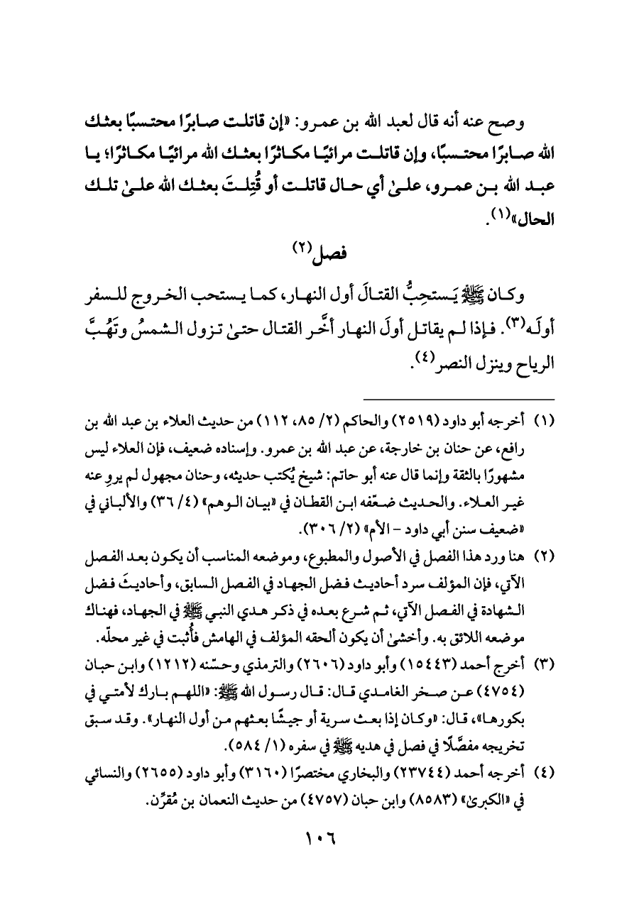 (¬٣) أخرج أحمد (١٥٤٤٣) وأبو داود (٢٦٠٦) والترمذي وحسّنه (١٢١٢) وابن حبان (٤٧٥٤) عن صخر الغامدي قال: قال رسول الله - صلى الله عليه وسلم -: «اللهم بارك لأمتي في بكورها»، قال: «وكان إذا بعث سرية أو جيشًا بعثهم من أول النهار». وقد سبق تخريجه مفصَّلًا في فصل في هديه - صلى الله عليه وسلم - في سفره (١/ ٥٨٤).