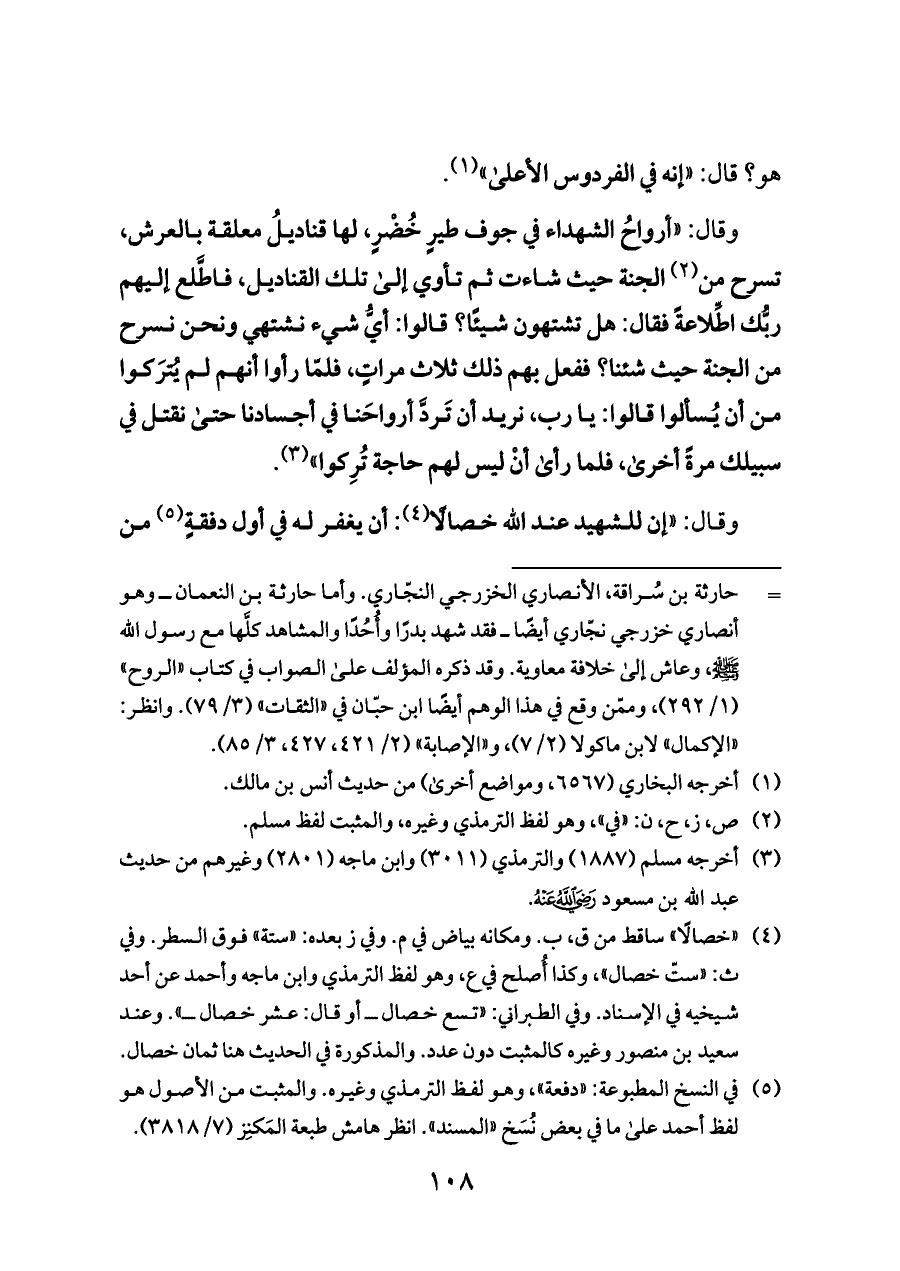 وقال: «أرواحُ الشهداء في جوف طيرٍ خُضْرٍ، لها قناديلُ معلقة بالعرش، تسرح من (¬٢) الجنة حيث شاءت ثم تأوي إلى تلك القناديل، فاطَّلع إليهم ربُّك اطِّلاعةً فقال: هل تشتهون شيئًا؟ قالوا: أيُّ شيء نشتهي ونحن نسرح من الجنة حيث شئنا؟ ففعل بهم ذلك ثلاث مراتٍ، فلمّا رأوا أنهم لم يُترَكوا من أن يُسألوا قالوا: يا رب، نريد أن تَردَّ أرواحَنا في أجسادنا حتى نقتل في سبيلك مرةً أخرى، فلما رأى أنْ ليس لهم حاجة تُرِكوا» (¬٣).