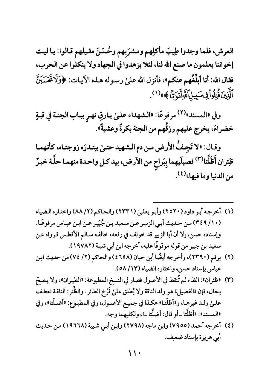العرش، فلما وجدوا طِيبَ مأكلِهم ومشرَبِهم وحُسْنَ مقيلهم قالوا: يا ليت إخواننا يعلمون ما صنع الله لنا، لئلا يزهدوا في الجهاد ولا ينكلوا عن الحرب، فقال الله: أنا أبلِّغُهم عنكم»، فأنزل الله على رسوله هذه الآيات: {وَلَا تَحْسَبَنَّ الَّذِينَ قُتِلُوا فِي سَبِيلِ اللَّهِ أَمْوَاتًا}» (¬١).