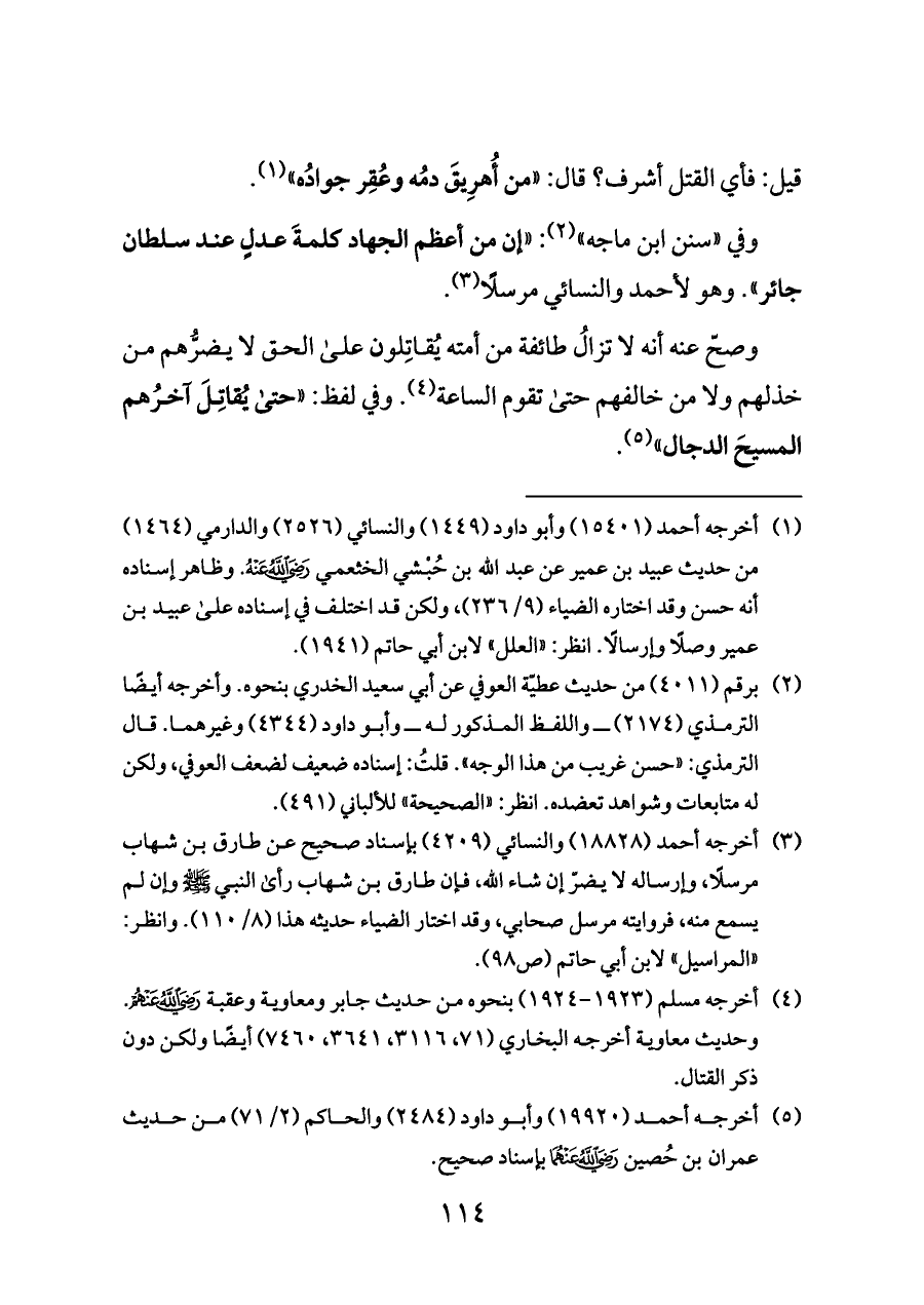 وفي «سنن ابن ماجه» (¬٢): «إن من أعظم الجهاد كلمةَ عدلٍ عند سلطان جائر». وهو لأحمد والنسائي مرسلًا (¬٣).