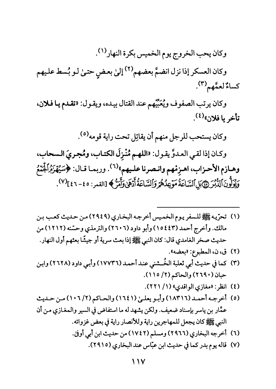 وكان إذا لقي العدوَّ يقول: «اللهم مُنْزِلَ الكتاب، ومُجريَ السحاب، وهازم الأحزاب، اهزِمْهم وانصرنا عليهم» (¬٦). وربما قال: {سَيُهْزَمُ الْجَمْعُ وَيُوَلُّونَ الدُّبُرَ (٤٥) بَلِ السَّاعَةُ مَوْعِدُهُمْ وَالسَّاعَةُ أَدْهَى وَأَمَرُّ} [القمر: ٤٥ - ٤٦] (¬٧).