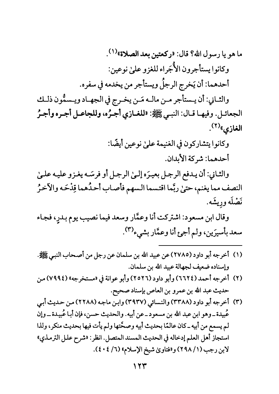 (¬٣) أخرجه أبو داود (٣٣٨٨) والنسائي (٣٩٣٧) وابن ماجه (٢٢٨٨) من حديث أبي عُبيدة ــ وهو ابن عبد الله بن مسعود ــ عن أبيه. والحديث حسن، فإن أبا عُبيدة ــ وإن لم يسمع من أبيه ــ كان عالمًا بحديث أبيه وصحَّتها ولم يأت فيها بحديث منكر، ولذا استجاز أهل العلم إدخاله في الحديث المسند المتصل. انظر: «شرح علل الترمذي» لابن رجب (١/ ٢٩٨) و «فتاوى شيخ الإسلام» (٦/ ٤٠٤).