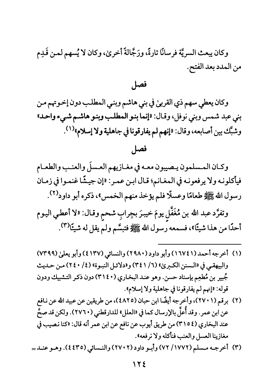 وكان يبعث السريَّة فرسانًا تارةً، ورَجَّالةً أخرى، وكان لا يُسهم لمن قَدِم من المدد بعد الفتح.