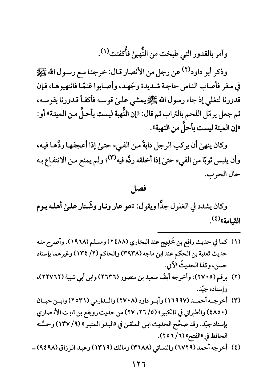 وذكر أبو داود (¬٢) عن رجل من الأنصار قال: خرجنا مع رسول الله - صلى الله عليه وسلم - في سفر فأصاب الناس حاجة شديدة وجَهد، وأصابوا غنمًا فانتهبوها، فإن قدورنا لتغلي إذ جاء رسول الله - صلى الله عليه وسلم - يمشي على قوسه فأكفأ قدورنا بقوسه، ثم جعل يرمّل اللحم بالتراب ثم قال: «إن النُّهبة ليست بأحلَّ من الميتة» أو: «إن الميتة ليست بأحلَّ من النهبة».