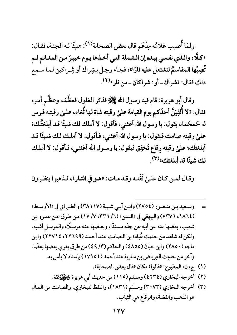 ولمّا أُصيب غلامُه مِدْعَم قال بعض الصحابة (¬١): هنيئًا له الجنة، فقال: «كلَّا، والذي نفسي بيده إن الشملة التي أخذها يوم خيبرَ من المغانم لم تُصِبْها المقاسمُ لتشتعل عليه نارًا»، فجاء رجل بشِراك أو شِراكين لما سمع ذلك فقال: «شراك ــ أو: شراكان ــ من نار» (¬٢).