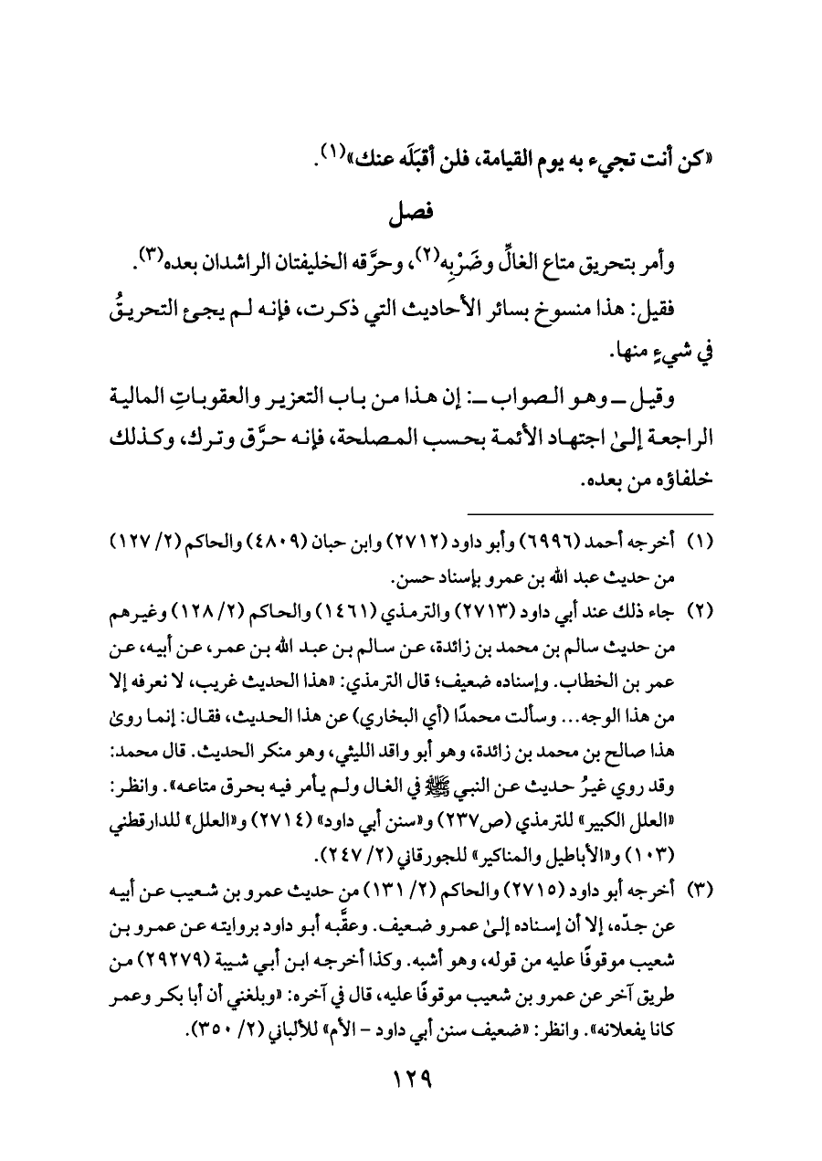(¬٢) جاء ذلك عند أبي داود (٢٧١٣) والترمذي (١٤٦١) والحاكم (٢/ ١٢٨) وغيرهم من حديث سالم بن محمد بن زائدة، عن سالم بن عبد الله بن عمر، عن أبيه، عن عمر بن الخطاب. وإسناده ضعيف؛ قال الترمذي: «هذا الحديث غريب، لا نعرفه إلا من هذا الوجه ... وسألت محمدًا (أي البخاري) عن هذا الحديث، فقال: إنما روى هذا صالح بن محمد بن زائدة، وهو أبو واقد الليثي، وهو منكر الحديث. قال محمد: وقد روي غيرُ حديث عن النبي - صلى الله عليه وسلم - في الغال ولم يأمر فيه بحرق متاعه». وانظر: «العلل الكبير» للترمذي (ص ٢٣٧) و «سنن أبي داود» (٢٧١٤) و «العلل» للدارقطني (١٠٣) و «الأباطيل والمناكير» للجورقاني (٢/ ٢٤٧).