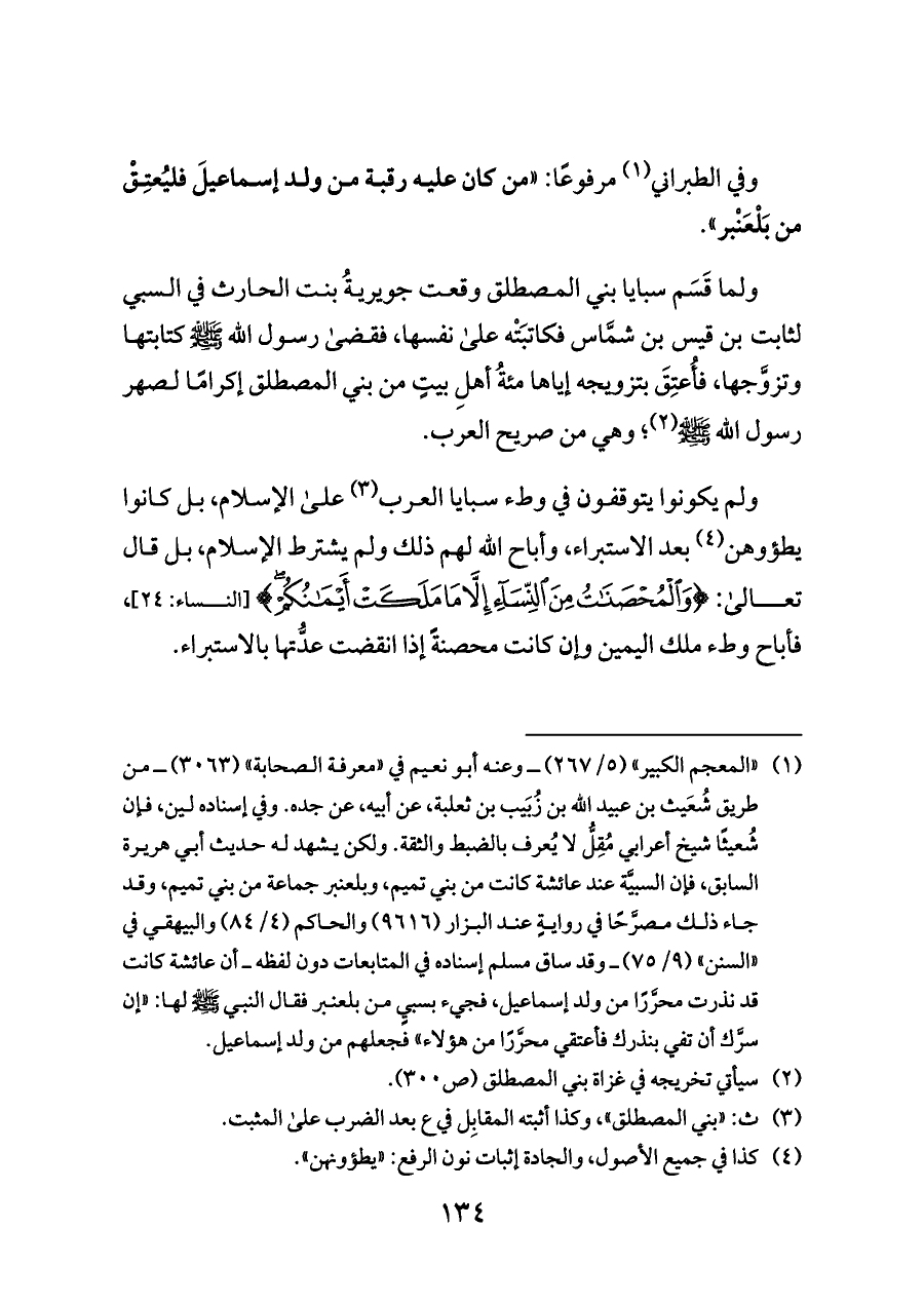 ولم يكونوا يتوقفون في وطء سبايا العرب (¬٣) على الإسلام، بل كانوا يطؤوهن (¬٤) بعد الاستبراء، وأباح الله لهم ذلك ولم يشترط الإسلام، بل قال تعالى: {وَالْمُحْصَنَاتُ مِنَ النِّسَاءِ إِلَّا مَا مَلَكَتْ أَيْمَانُكُمْ} [النساء: ٢٤]، فأباح وطء ملك اليمين وإن كانت محصنةً إذا انقضت عدُّتها بالاستبراء.