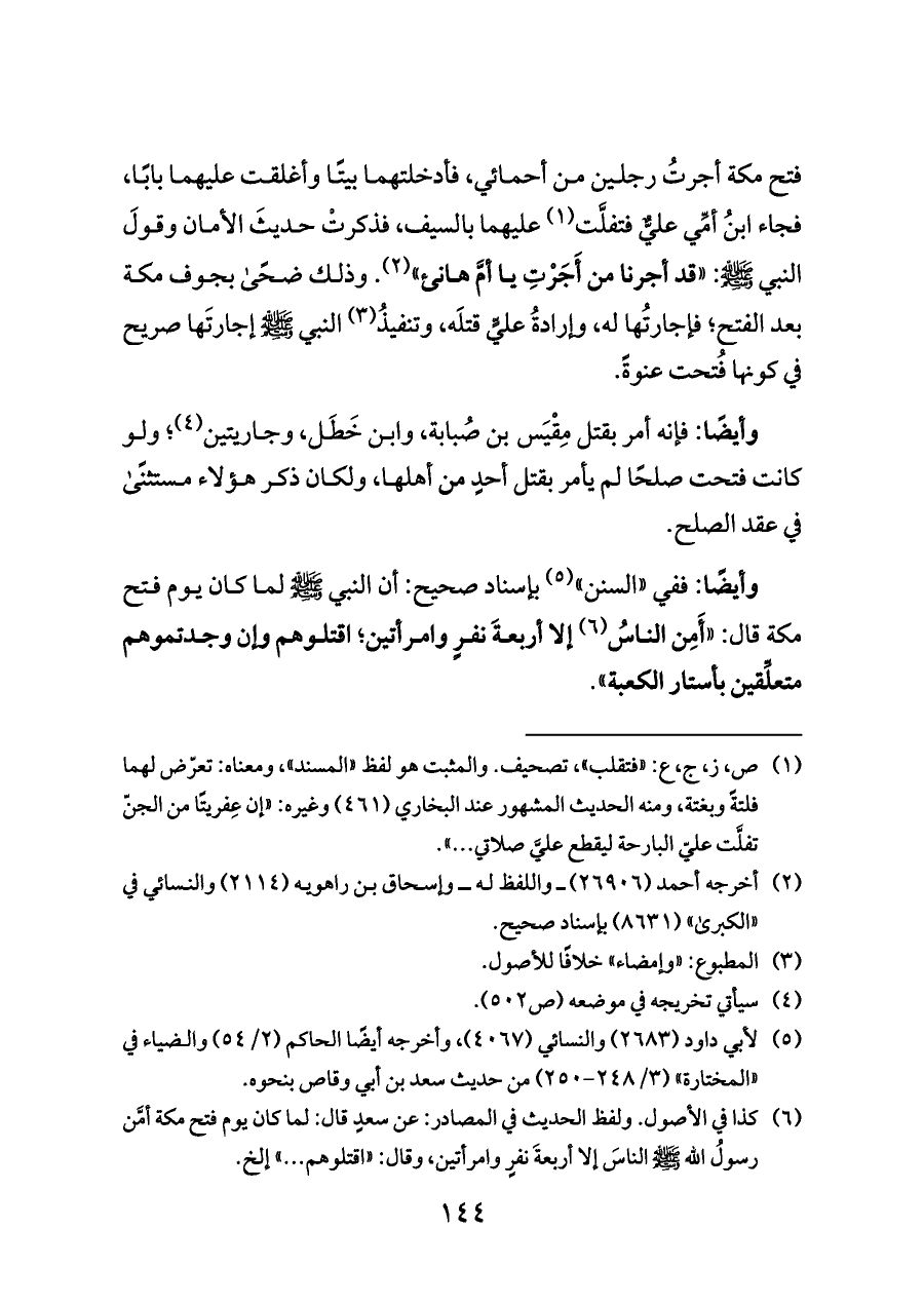 فتح مكة أجرتُ رجلين من أحمائي، فأدخلتهما بيتًا وأغلقت عليهما بابًا، فجاء ابنُ أمِّي عليٌّ فتفلَّت (¬١) عليهما بالسيف، فذكرتْ حديثَ الأمان وقولَ النبي - صلى الله عليه وسلم -: «قد أجرنا من أَجَرْتِ يا أمَّ هانئ» (¬٢). وذلك ضحًى بجوف مكة بعد الفتح؛ فإجارتُها له، وإرادةُ عليٍّ قتلَه، وتنفيذُ (¬٣) النبي - صلى الله عليه وسلم - إجارتَها صريح في كونها فُتحت عنوةً.