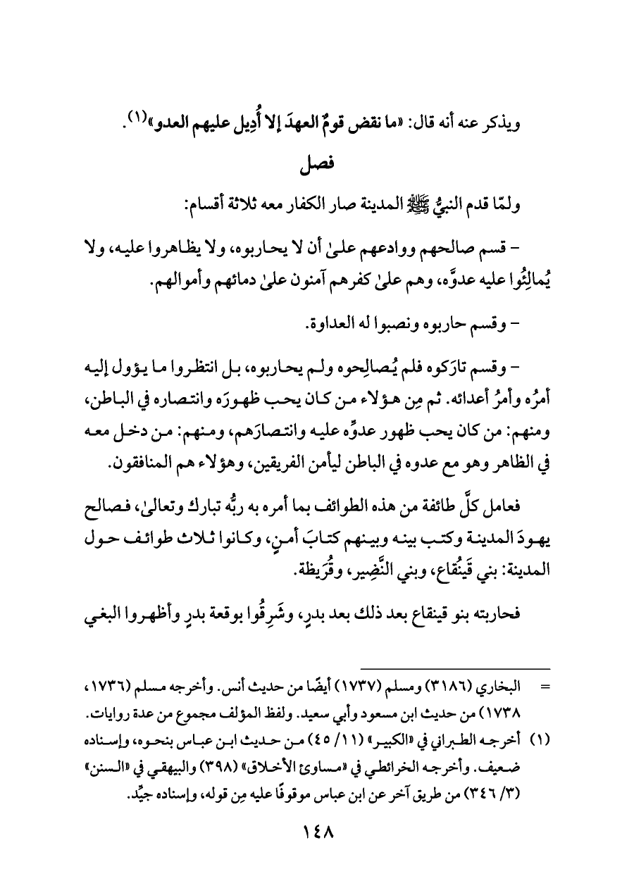 ولمّا قدم النبيُّ - صلى الله عليه وسلم - المدينة صار الكفار معه ثلاثة أقسام: