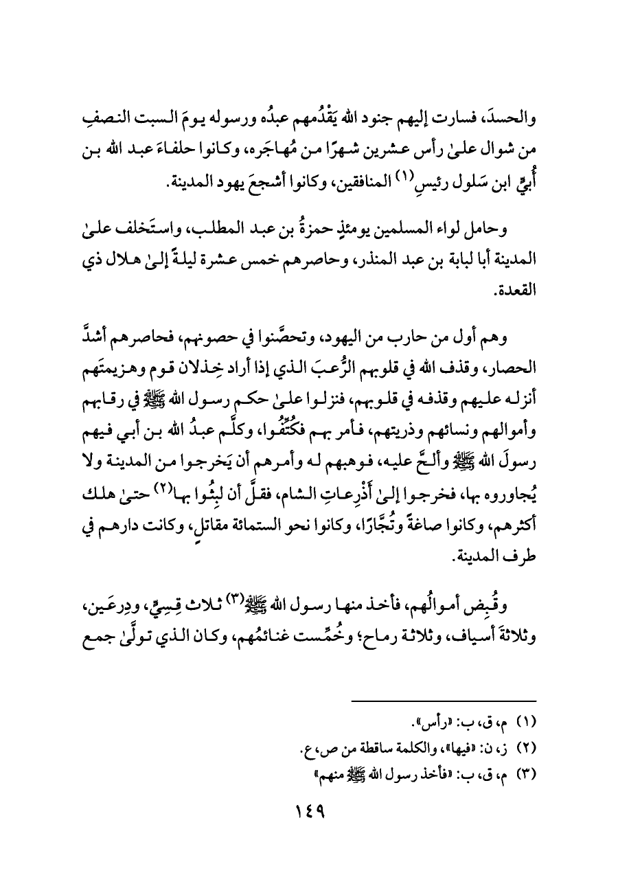 والحسدَ، فسارت إليهم جنود الله يَقْدُمهم عبدُه ورسوله يومَ السبت النصفِ من شوال على رأس عشرين شهرًا من مُهاجَره، وكانوا حلفاءَ عبد الله بن أُبيٍّ ابن سَلول رئيسِ (¬١) المنافقين، وكانوا أشجعَ يهود المدينة.