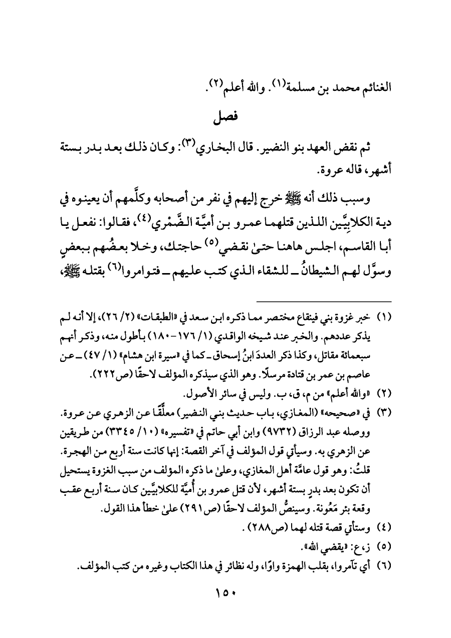 (¬٣) في «صحيحه» (المغازي، باب حديث بني النضير) معلًّقًا عن الزهري عن عروة. ووصله عبد الرزاق (٩٧٣٢) وابن أبي حاتم في «تفسيره» (١٠/ ٣٣٤٥) من طريقين عن الزهري به. وسيأتي قول المؤلف في آخر القصة: إنها كانت سنة أربع من الهجرة. قلتُ: وهو قول عامَّة أهل المغازي، وعلى ما ذكره المؤلف من سبب الغزوة يستحيل أن تكون بعد بدرٍ بستة أشهر، لأن قتل عمرو بن أُميَّة للكلابيَّين كان سنة أربع عقب وقعة بئر مَعُونة. وسينصُّ المؤلف لاحقًا (ص ٢٩١) على خطأ هذا القول.