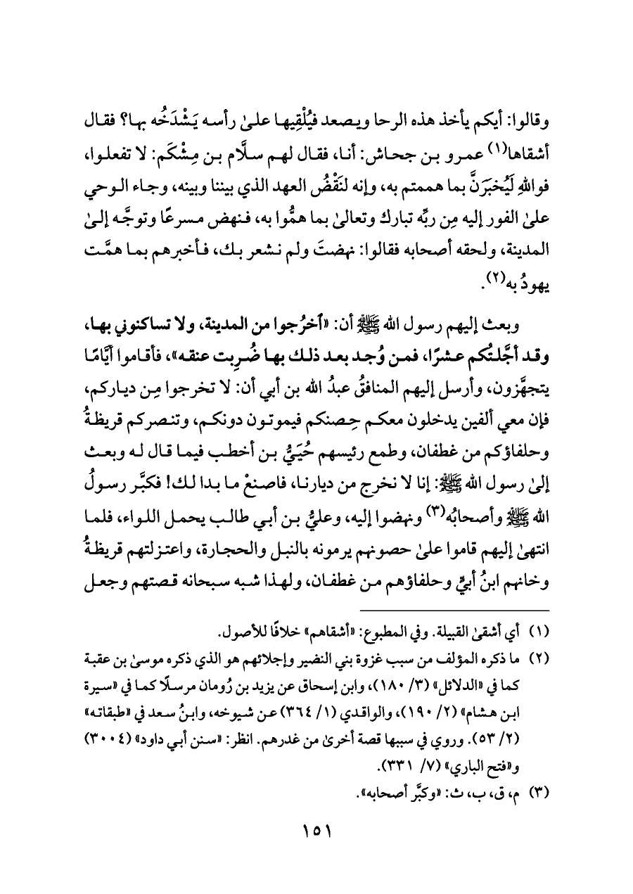 (¬٢) ما ذكره المؤلف من سبب غزوة بني النضير وإجلائهم هو الذي ذكره موسى بن عقبة كما في «الدلائل» (٣/ ١٨٠)، وابن إسحاق عن يزيد بن رُومان مرسلًا كما في «سيرة ابن هشام» (٢/ ١٩٠)، والواقدي (١/ ٣٦٤) عن شيوخه، وابنُ سعد في «طبقاته» (٢/ ٥٣). وروي في سببها قصة أخرى من غدرهم. انظر: «سنن أبي داود» (٣٠٠٤) و «فتح الباري» (٧/ ٣٣١).