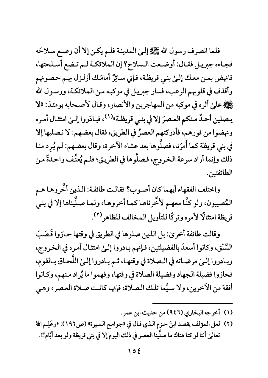 (¬٢) لعل المؤلف يقصد ابنَ حزم الذي قال في «جوامع السيرة» (ص ١٩٢): «وعَلِم اللهُ تعالى أننا لو كنا هناك ما صلَّينا العصر في ذلك اليوم إلا في بني قريظة ولو بعد أيَّام!».