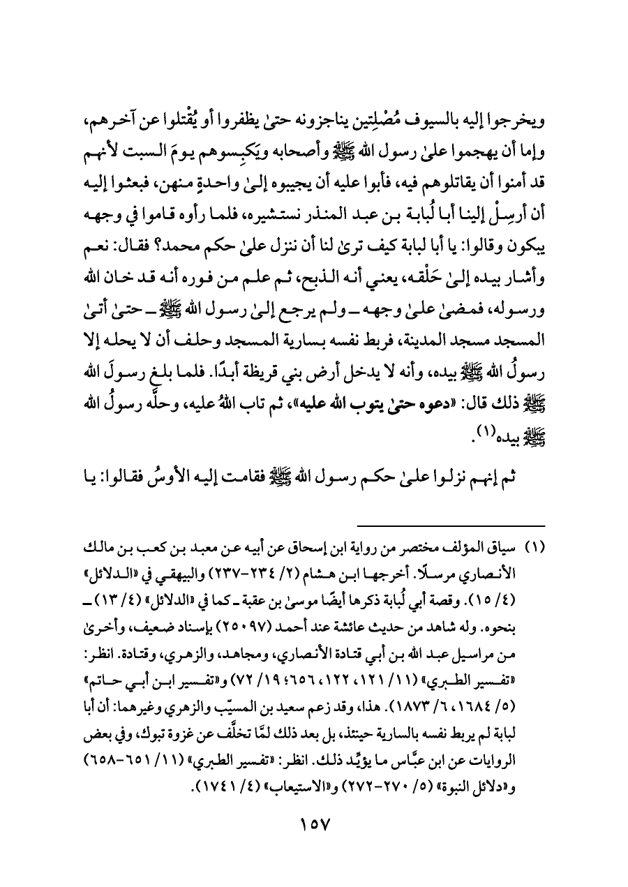 (¬١) سياق المؤلف مختصر من رواية ابن إسحاق عن أبيه عن معبد بن كعب بن مالك الأنصاري مرسلًا. أخرجها ابن هشام (٢/ ٢٣٤ - ٢٣٧) والبيهقي في «الدلائل» (٤/ ١٥). وقصة أبي لُبابة ذكرها أيضًا موسى بن عقبة ــ كما في «الدلائل» (٤/ ١٣) ــ بنحوه. وله شاهد من حديث عائشة عند أحمد (٢٥٠٩٧) بإسناد ضعيف، وأخرى من مراسيل عبد الله بن أبي قتادة الأنصاري، ومجاهد، والزهري، وقتادة. انظر: «تفسير الطبري» (١١/ ١٢١، ١٢٢، ٦٥٦؛ ١٩/ ٧٢) و «تفسير ابن أبي حاتم» (٥/ ١٦٨٤، ٦/ ١٨٧٣) .. هذا، وقد زعم سعيد بن المسيّب والزهري وغيرهما: أن أبا لبابة لم يربط نفسه بالسارية حينئذ، بل بعد ذلك لمَّا تخلَّف عن غزوة تبوك، وفي بعض الروايات عن ابن عبَّاس ما يؤيِّد ذلك. انظر: «تفسير الطبري» (١١/ ٦٥١ - ٦٥٨) و «دلائل النبوة» (٥/ ٢٧٠ - ٢٧٢) و «الاستيعاب» (٤/ ١٧٤١).