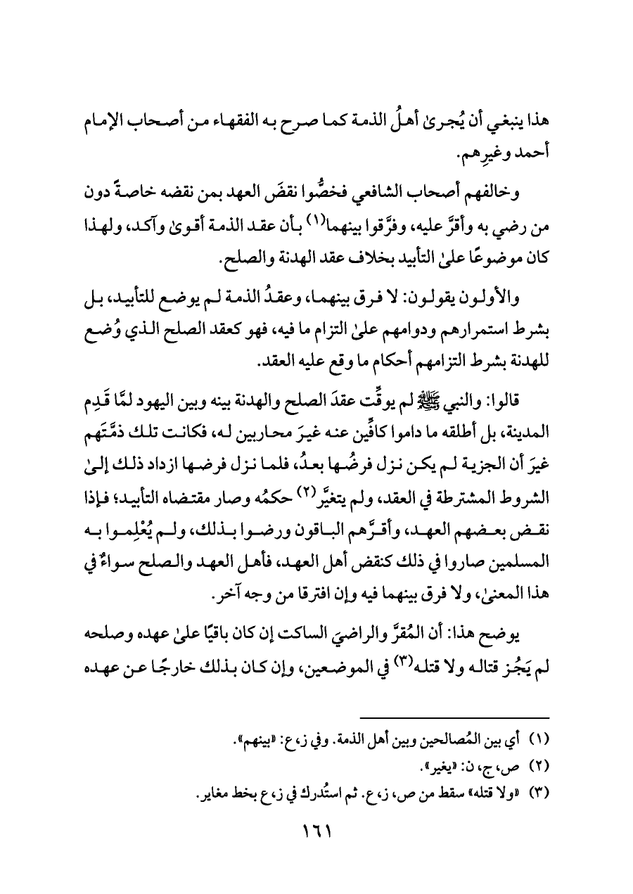 قالوا: والنبي - صلى الله عليه وسلم - لم يوقِّت عقدَ الصلح والهدنة بينه وبين اليهود لمَّا قَدِم المدينة، بل أطلقه ما داموا كافِّين عنه غيرَ محاربين له، فكانت تلك ذمَّتَهم غيرَ أن الجزية لم يكن نزل فرضُها بعدُ، فلما نزل فرضها ازداد ذلك إلى الشروط المشترطة في العقد، ولم يتغيَّر (¬٢) حكمُه وصار مقتضاه التأبيد؛ فإذا نقض بعضهم العهد، وأقرَّهم الباقون ورضوا بذلك، ولم يُعْلِموا به المسلمين صاروا في ذلك كنقض أهل العهد، فأهل العهد والصلح سواءٌ في هذا المعنى، ولا فرق بينهما فيه وإن افترقا من وجه آخر.