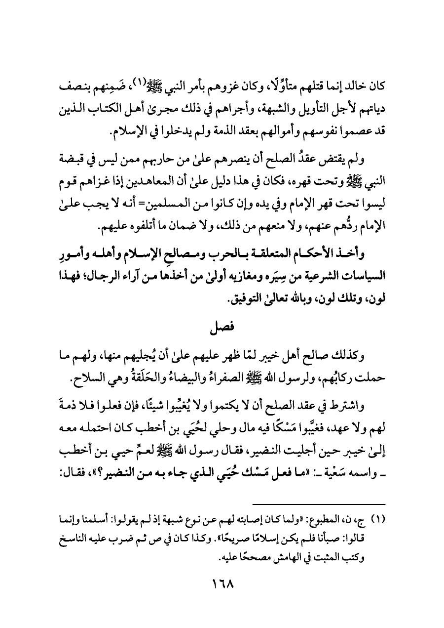 (¬١) ج، ن، المطبوع: «ولما كان إصابته لهم عن نوع شبهة إذ لم يقولوا: أسلمنا وإنما قالوا: صبأنا فلم يكن إسلامًا صريحًا». وكذا كان في ص ثم ضرب عليه الناسخ وكتب المثبت في الهامش مصححًا عليه.