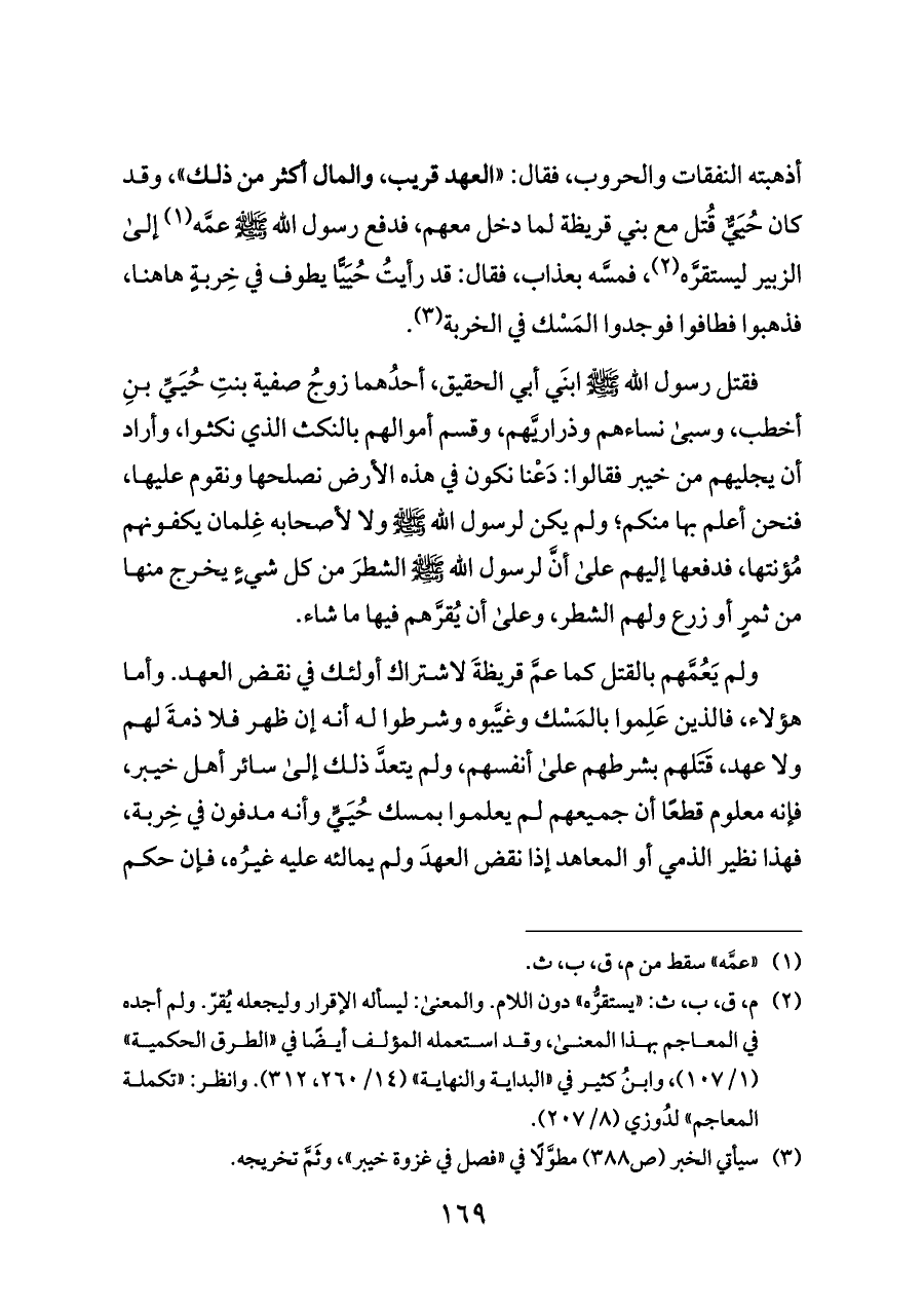 أذهبته النفقات والحروب، فقال: «العهد قريب، والمال أكثر من ذلك»، وقد كان حُيَيٌّ قُتل مع بني قريظة لما دخل معهم، فدفع رسول الله - صلى الله عليه وسلم - عمَّه (¬١) إلى الزبير ليستقرَّه (¬٢)، فمسَّه بعذاب، فقال: قد رأيتُ حُيَيًّا يطوف في خِربةٍ هاهنا، فذهبوا فطافوا فوجدوا المَسْك في الخربة (¬٣).