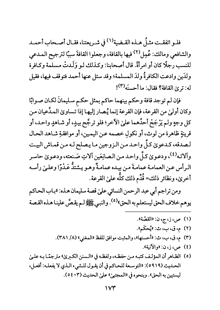 فإن لم توجد قافة وحكم بينهما حاكم بمثل حكمِ سليمانَ لكان صوابًا وكان أولى من القرعة، فإن القرعة إنما يُصار إليها إذا تساوى المدَّعيان من كل وجهٍ ولم يَرْجَحْ أحدُهما على الآخر؛ فلو ترجَّح بيدٍ، أو شاهدٍ واحد، أو قرينةٍ ظاهرة من لوث، أو نكولِ خصمه عن اليمين، أو موافقةِ شاهد الحال لصدقه، كدعوى كلِّ واحد من الزوجين ما يصلح له من قماش البيت وآلاته (¬٤)، ودعوى كلِّ واحد من الصانِعَين آلاتِ صَنعته، ودعوى حاسر الرأس عن العمامة عمامةَ من بيده عمامةٌ وهو يشتدُّ عَدْوًا وعلى رأسه أخرى، ونظائر ذلك= قُدِّم ذلك كلُّه على القرعة.