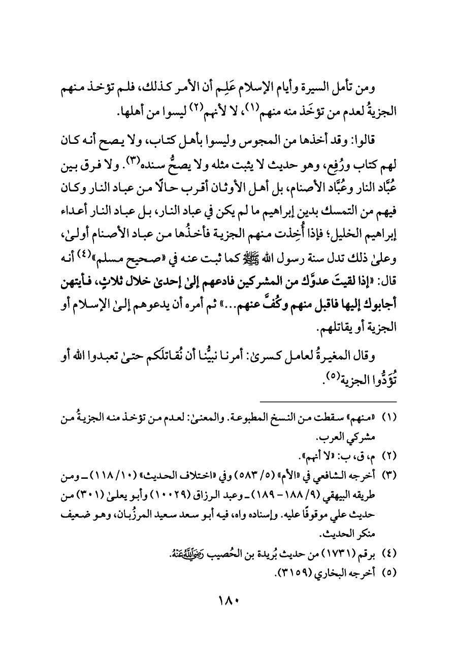 قالوا: وقد أخذها من المجوس وليسوا بأهل كتاب، ولا يصح أنه كان لهم كتاب ورُفِع، وهو حديث لا يثبت مثله ولا يصحُّ سنده (¬٣). ولا فرق بين عُبَّاد النار وعُبَّاد الأصنام، بل أهل الأوثان أقرب حالًا من عباد النار وكان فيهم من التمسك بدين إبراهيم ما لم يكن في عباد النار، بل عباد النار أعداء إبراهيم الخليل؛ فإذا أُخِذت منهم الجزية فأخذُها من عباد الأصنام أولى، وعلى ذلك تدل سنة رسول الله - صلى الله عليه وسلم - كما ثبت عنه في «صحيح مسلم» (¬٤) أنه قال: «إذا لقيتَ عدوَّك من المشركين فادعهم إلى إحدى خلال ثلاثٍ، فأيتهن أجابوك إليها فاقبل منهم وكُفَّ عنهم ... » ثم أمره أن يدعوهم إلى الإسلام أو الجزية أو يقاتلهم.