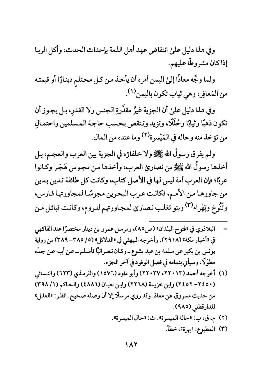 ولم يفرق رسولُ الله - صلى الله عليه وسلم - ولا خلفاؤه في الجزية بين العرب والعجم، بل أخذها رسولُ الله - صلى الله عليه وسلم - من نصارى العرب، وأخذها من مجوس هَجَر وكانوا عربًا؛ فإن العرب أمة ليس لها في الأصل كتاب، وكانت كل طائفة تدين بدين من جاورها من الأمم، فكانت عرب البحرين مجوسًا لمجاورتها فارس، وتَنُوخ وبَهْراء (¬٣) وبنو تغلب نصارى لمجاورتهم للروم، وكانت قبائل من