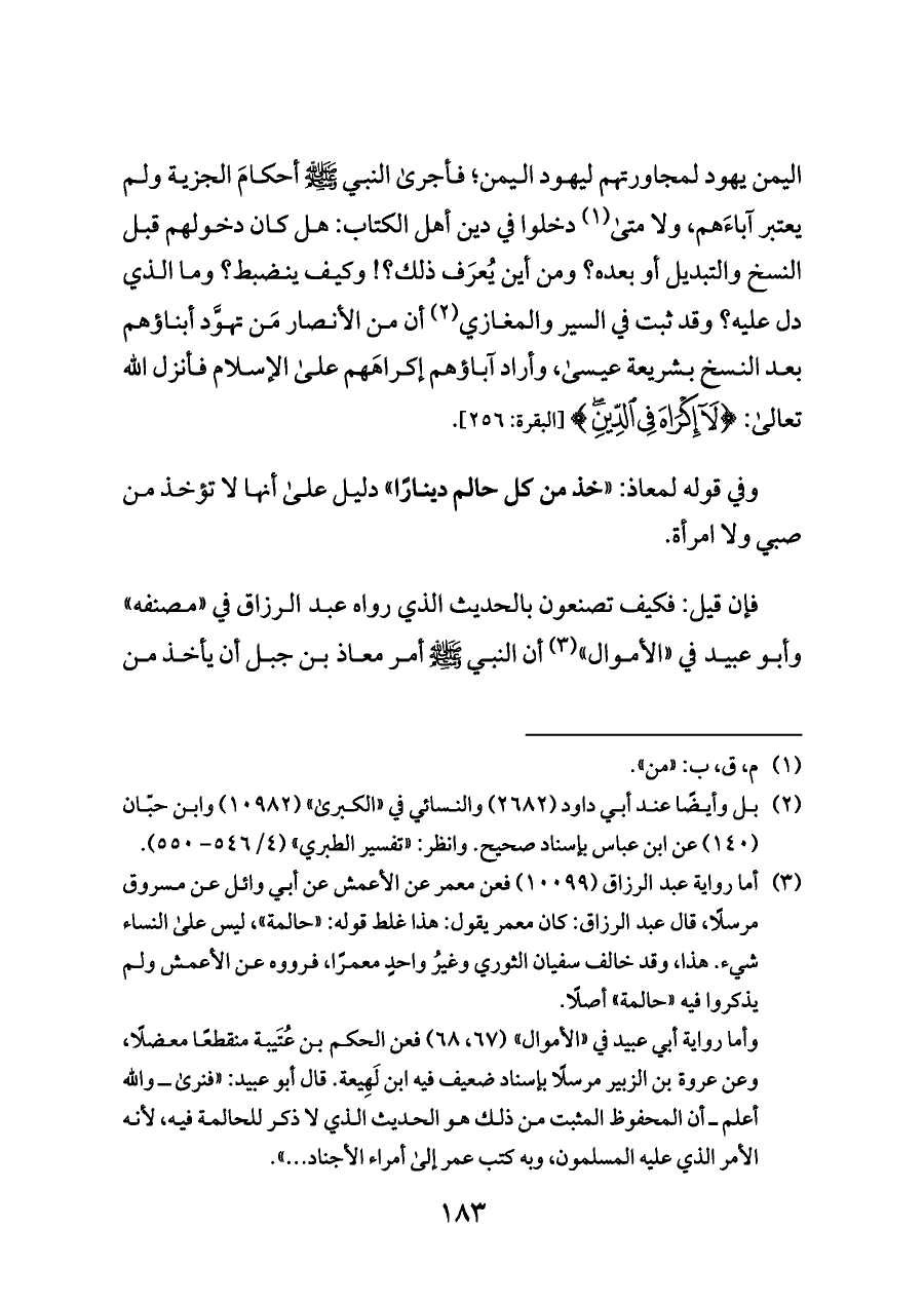 اليمن يهود لمجاورتهم ليهود اليمن؛ فأجرى النبي - صلى الله عليه وسلم - أحكامَ الجزية ولم يعتبر آباءَهم، ولا متى (¬١) دخلوا في دين أهل الكتاب: هل كان دخولهم قبل النسخ والتبديل أو بعده؟ ومن أين يُعرَف ذلك؟! وكيف ينضبط؟ وما الذي دل عليه؟ وقد ثبت في السير والمغازي (¬٢) أن من الأنصار مَن تهوَّد أبناؤهم بعد النسخ بشريعة عيسى، وأراد آباؤهم إكراهَهم على الإسلام فأنزل الله تعالى: {لَا إِكْرَاهَ فِي الدِّينِ} [البقرة: ٢٥٦].
