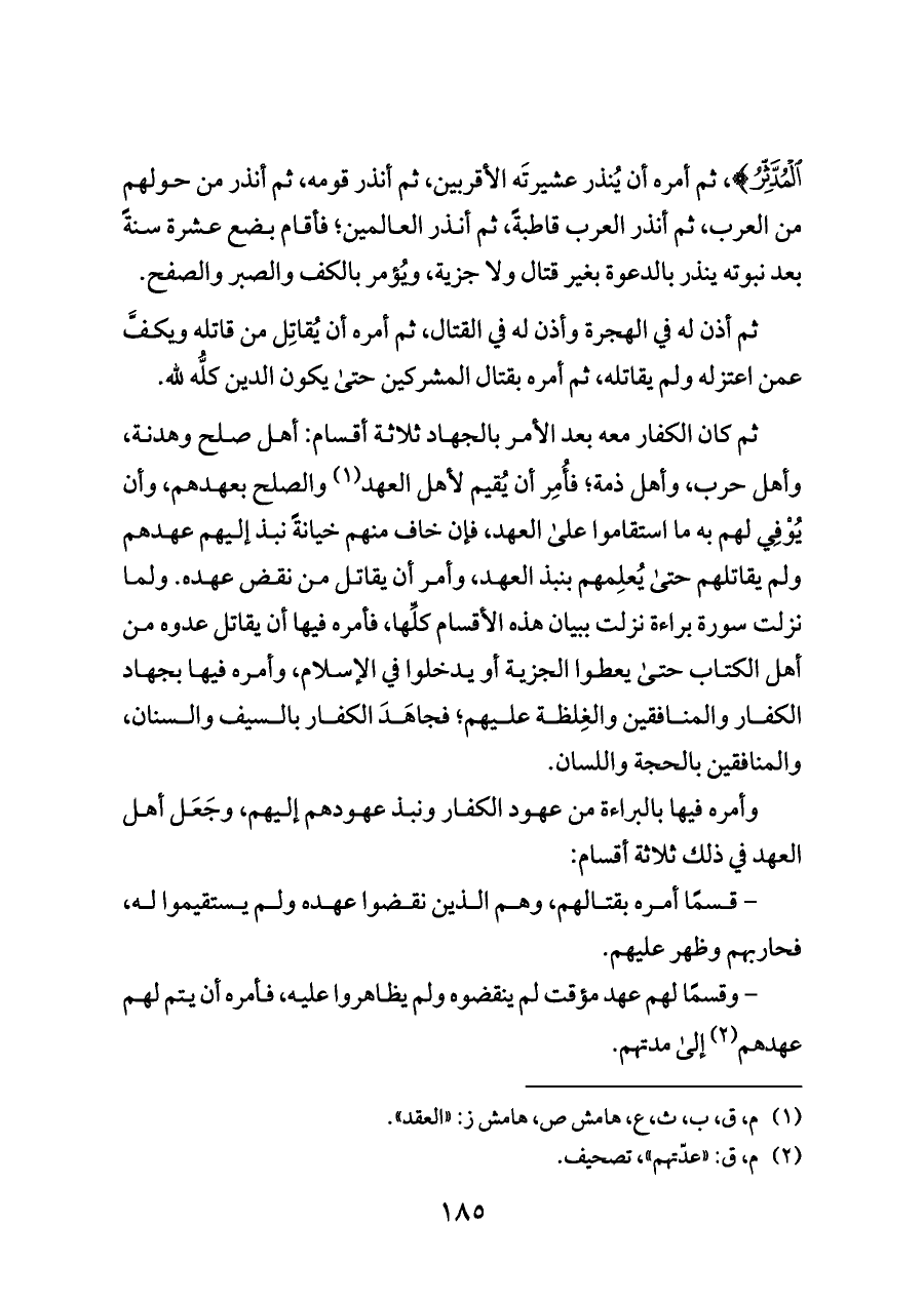 الْمُدَّثِّرُ} ثم أمره أن يُنذر عشيرتَه الأقربين، ثم أنذر قومه، ثم أنذر من حولهم من العرب، ثم أنذر العرب قاطبةً، ثم أنذر العالمين؛ فأقام بضع عشرة سنةً بعد نبوته ينذر بالدعوة بغير قتال ولا جزية، ويُؤمر بالكف والصبر والصفح.