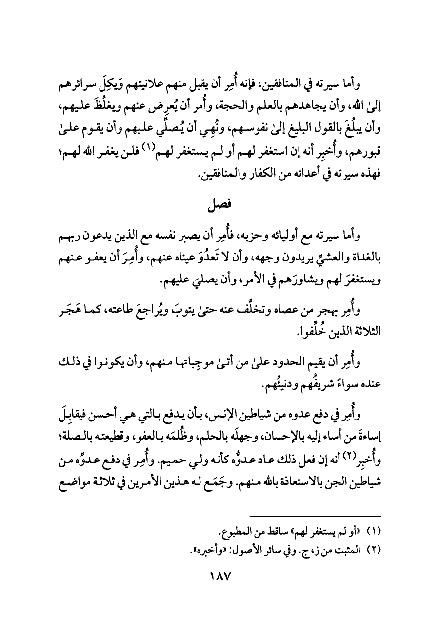 وأما سيرته في المنافقين، فإنه أُمِر أن يقبل منهم علانيتهم وَيكِلَ سرائرهم إلى الله، وأن يجاهدهم بالعلم والحجة، وأُمر أن يُعرِض عنهم ويغلُظَ عليهم، وأن يبلُغَ بالقول البليغ إلى نفوسهم، ونُهِي أن يُصلِّي عليهم وأن يقوم على قبورهم، وأُخبِر أنه إن استغفر لهم أو لم يستغفر لهم (¬١) فلن يغفر الله لهم؛ فهذه سيرته في أعدائه من الكفار والمنافقين.