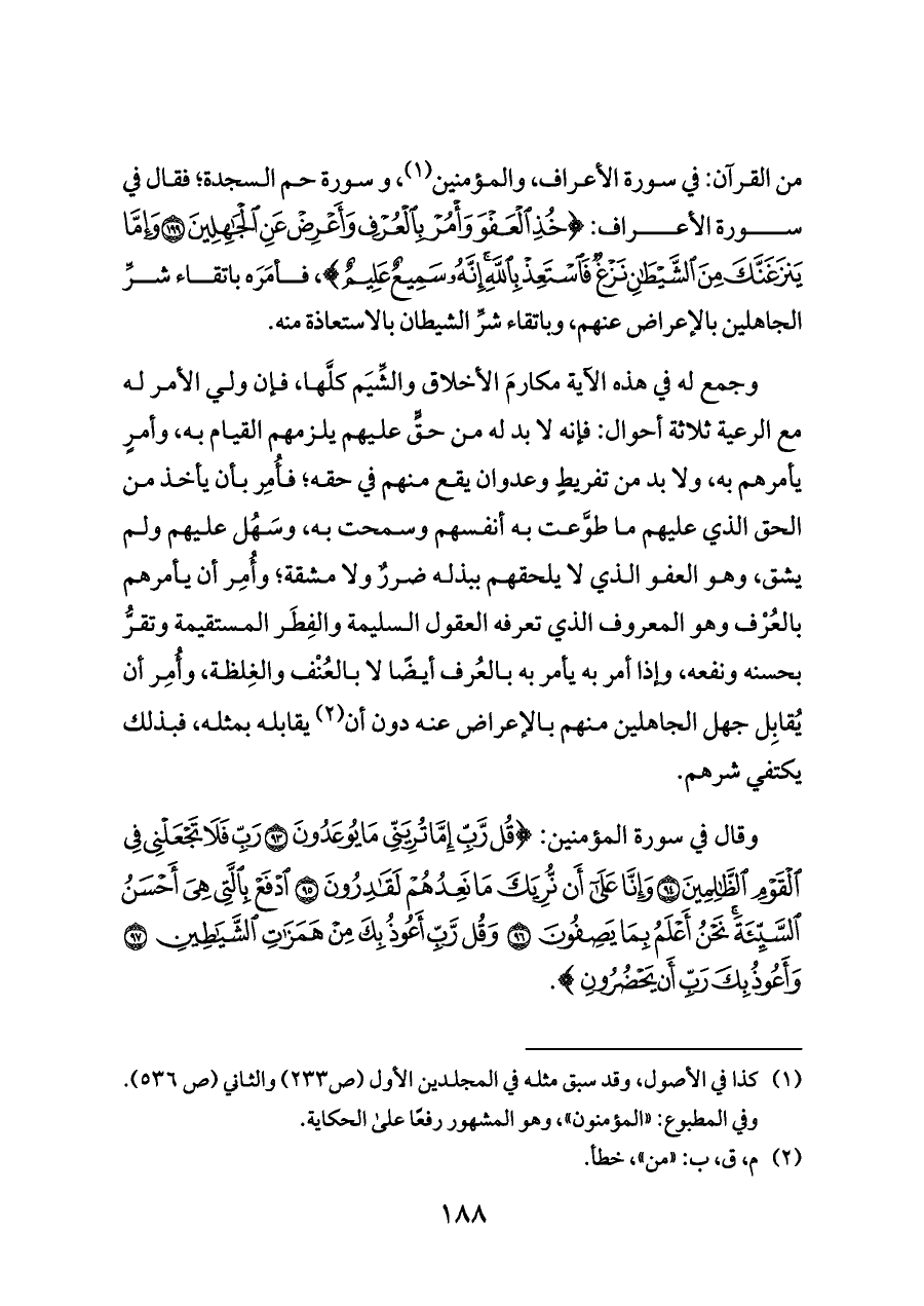من القرآن: في سورة الأعراف، والمؤمنين (¬١)، و سورة حم السجدة؛ فقال في سورة الأعراف: {خُذِ الْعَفْوَ وَأْمُرْ بِالْعُرْفِ وَأَعْرِضْ عَنِ الْجَاهِلِينَ (١٩٩) وَإِمَّا يَنْزَغَنَّكَ مِنَ الشَّيْطَانِ نَزْغٌ فَاسْتَعِذْ بِاللَّهِ إِنَّهُ سَمِيعٌ عَلِيمٌ}، فأمَرَه باتقاء شرِّ الجاهلين بالإعراض عنهم، وباتقاء شرِّ الشيطان بالاستعاذة منه.
